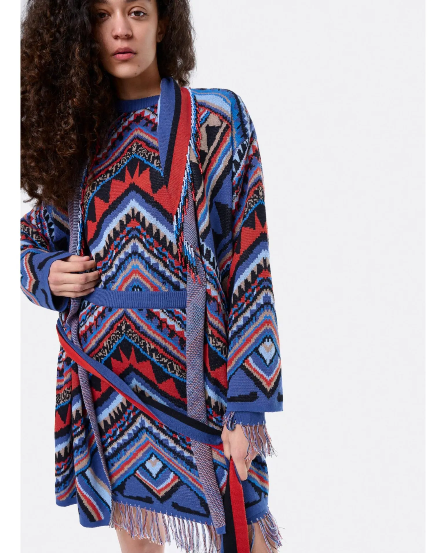 Cárdigan En Tejido De Punto, Con Estampado Étnico En Tonos Predominantes Rojos Y Azules. Detalles De Flecos Que Le Aportan Un Toque De Frescura Y Modernidad.