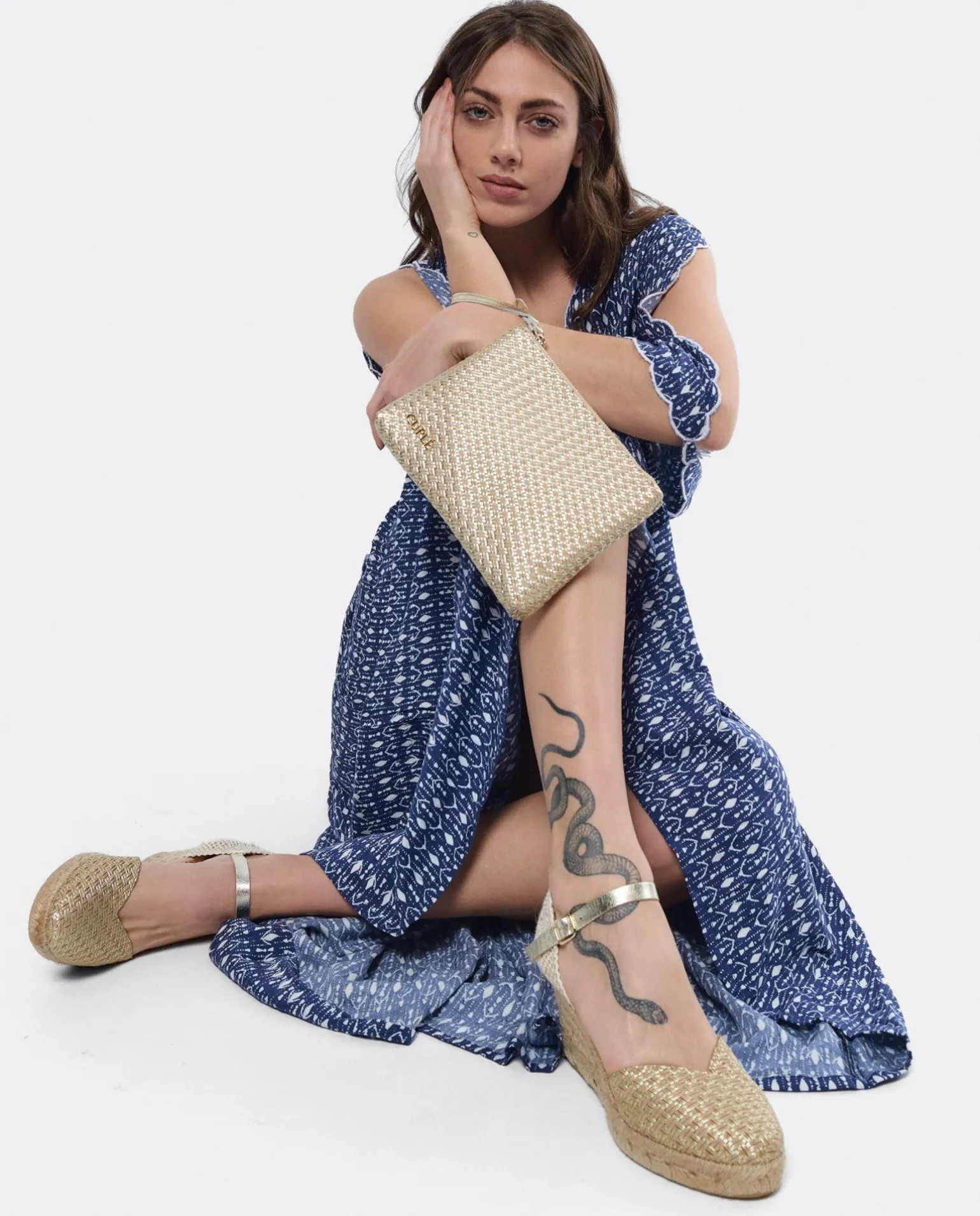 DescripciónCartera De Mano Realizada Con Tejido Trenzado De Color Oro Blanco. Dispone De Una Asa Para Un Mejor Agarre.