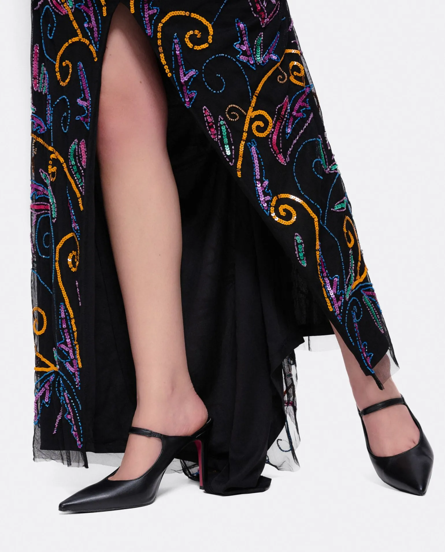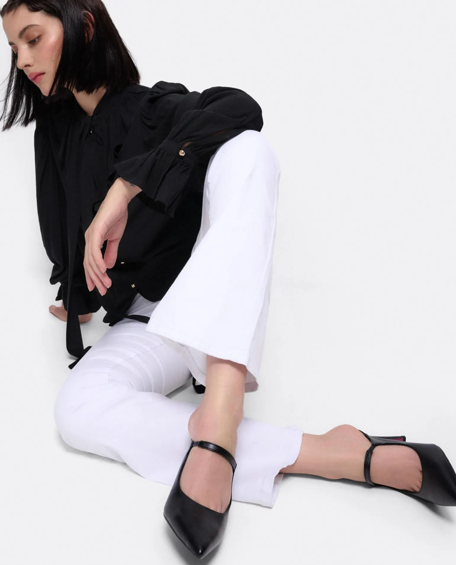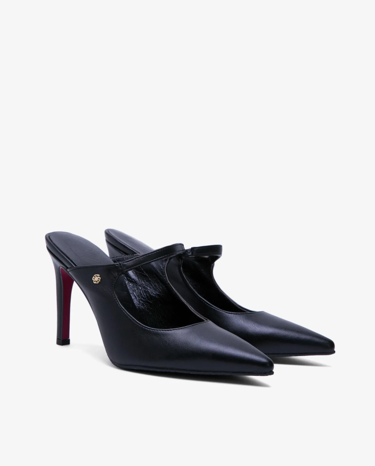 DescripciónDestalonado De TacÓN Alto Con Adorno Realizado En Napa De Color Negro. Para Estilismos Elegantes A Conjunto Con Una Falda Y Blusa De Colores Llamativos.Detalles Del Producto