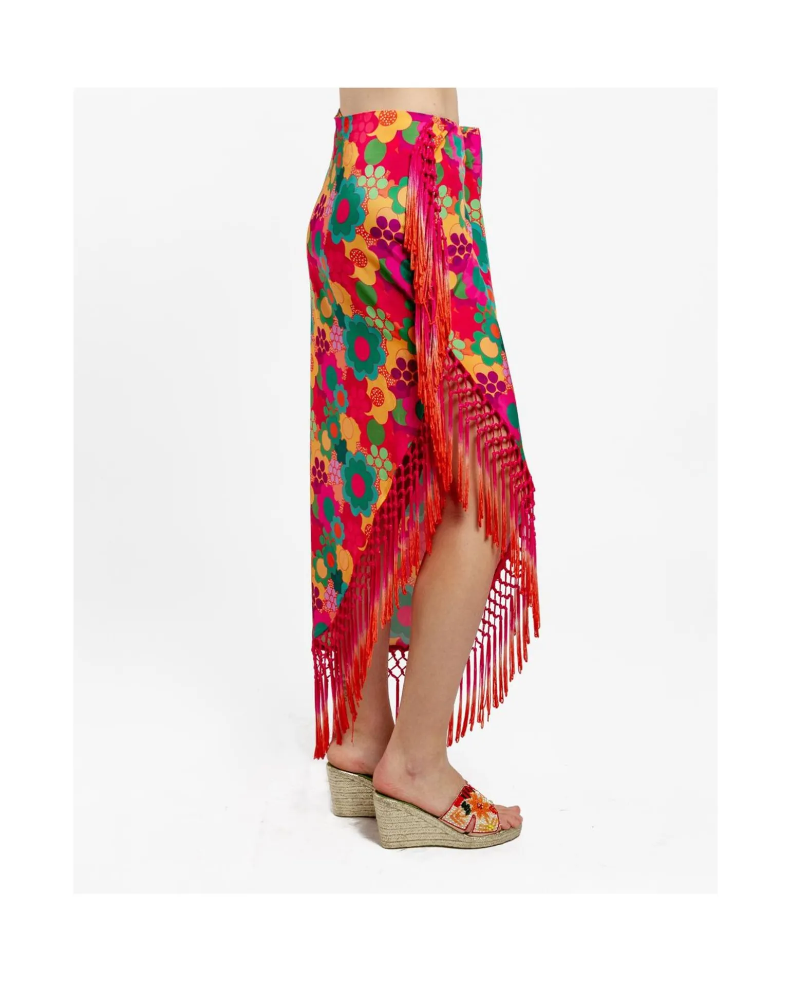 DescripciónFalda Estilo Pareo De Satén Asimétrico Con Estampado De Flores Multicolor Y Flecos En El Bajo. Ideal Para Combinar Con Su Top A Juego, O Crea Tus Mejores Looks Desde Cero.