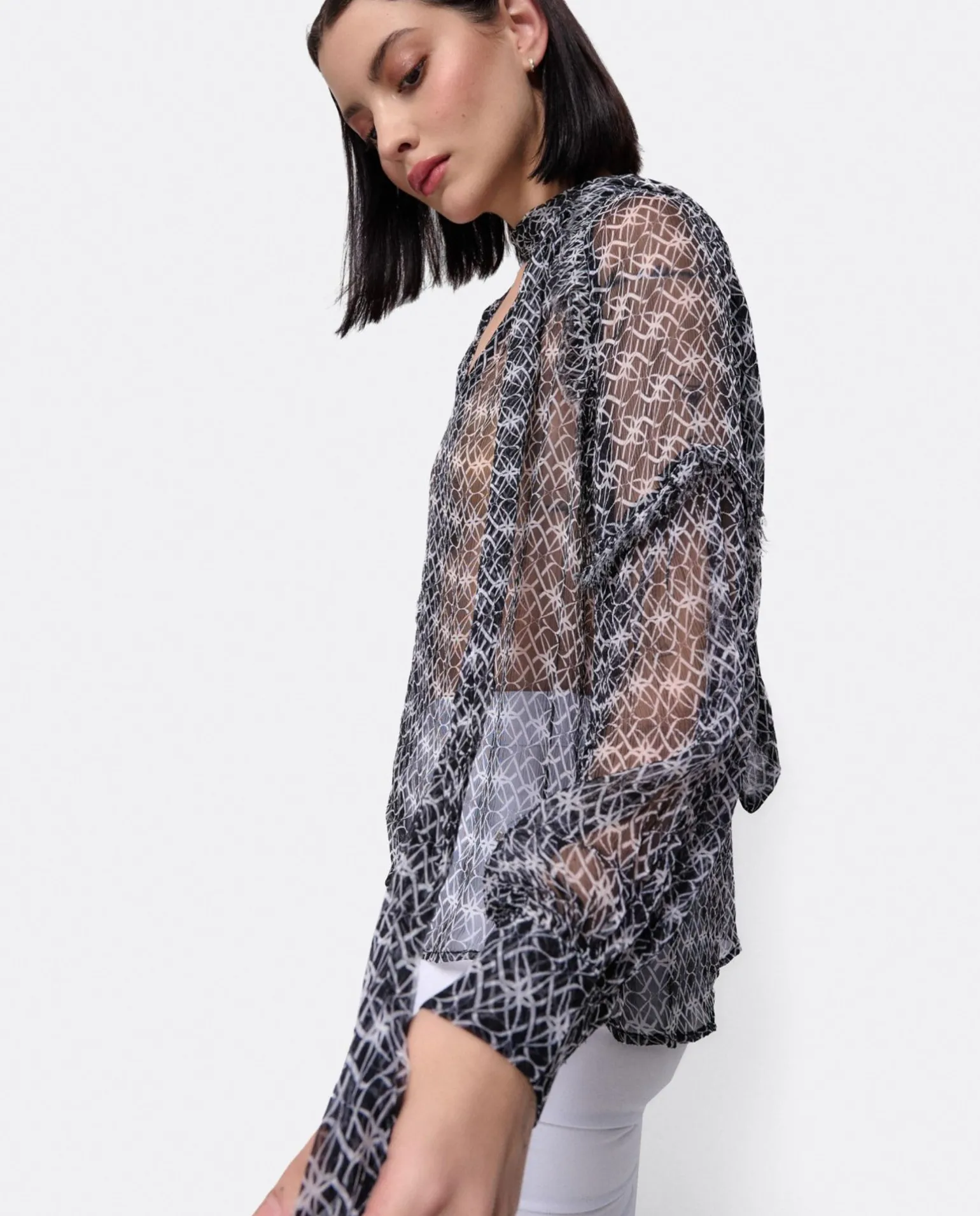 Maxiblusa Romántica Confeccionada En Gasa Con Un Estampado Monogram. Únete A La Tendencia De Las Transparencias Con Este Modelo Estilo Oversize Coronado Con Un Lazo Al Cuello.