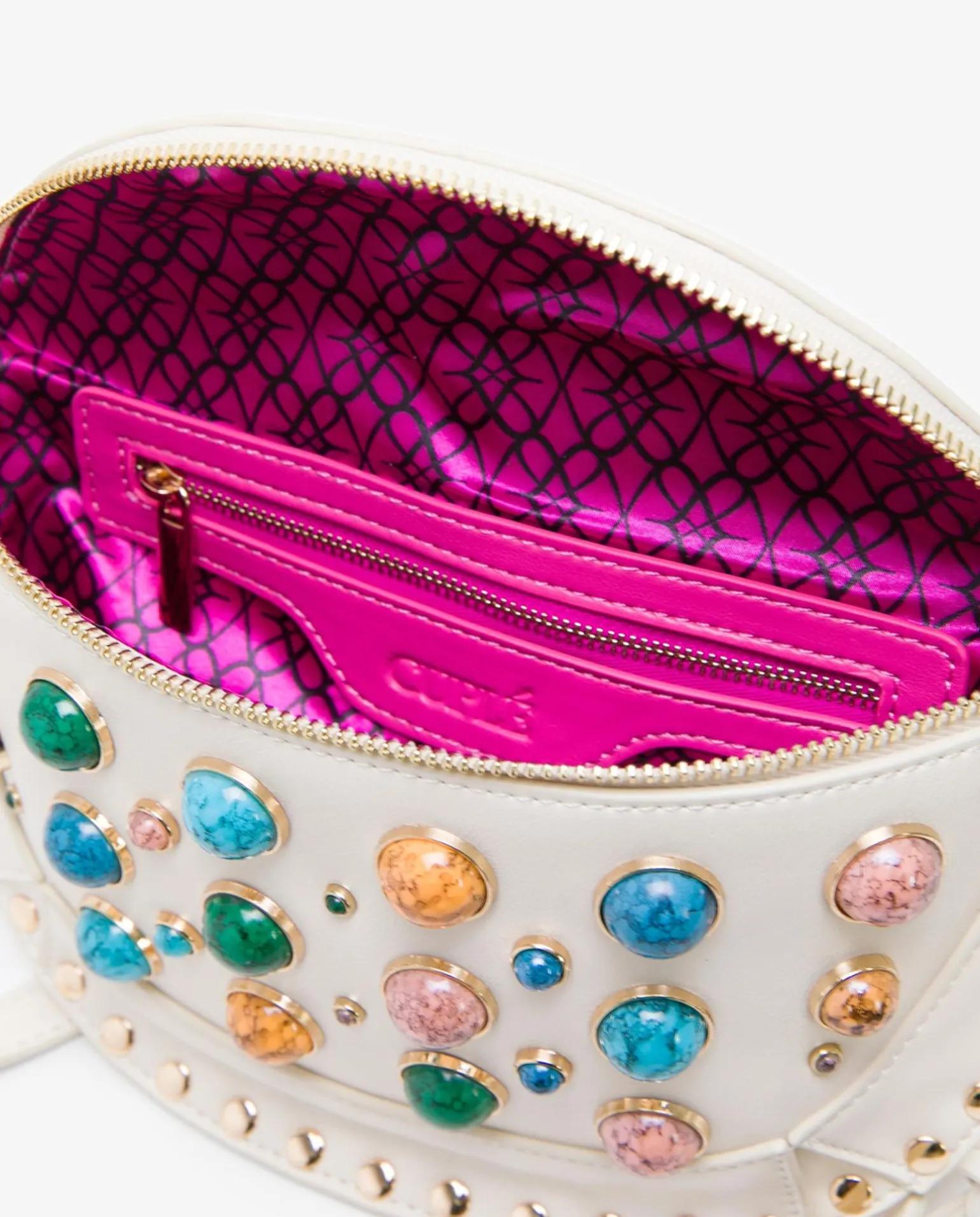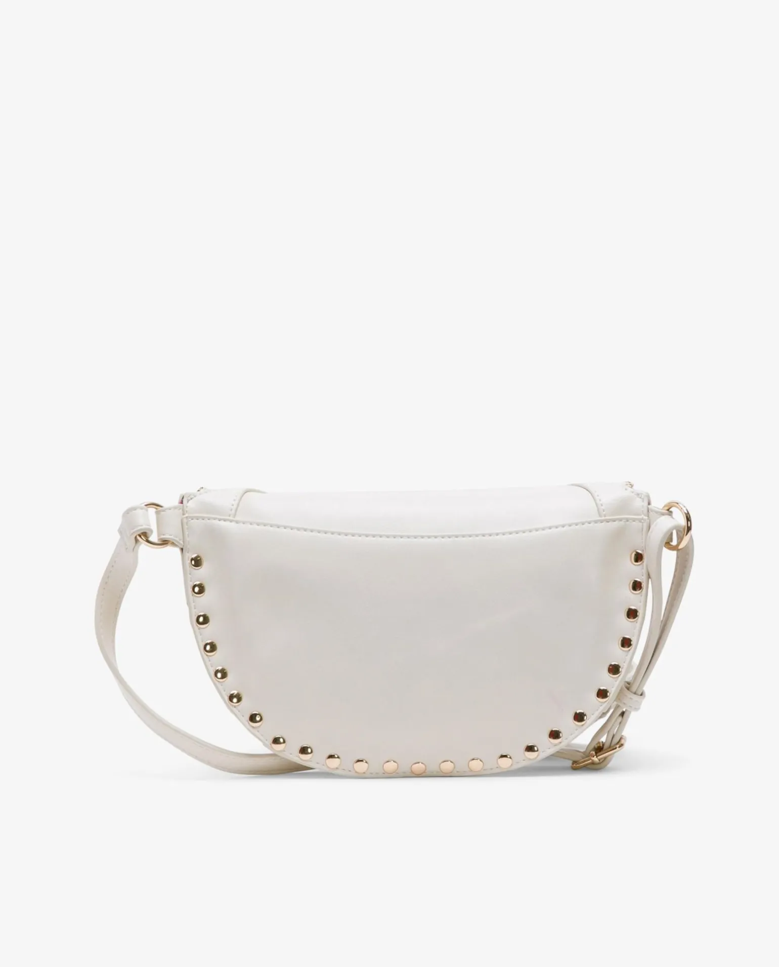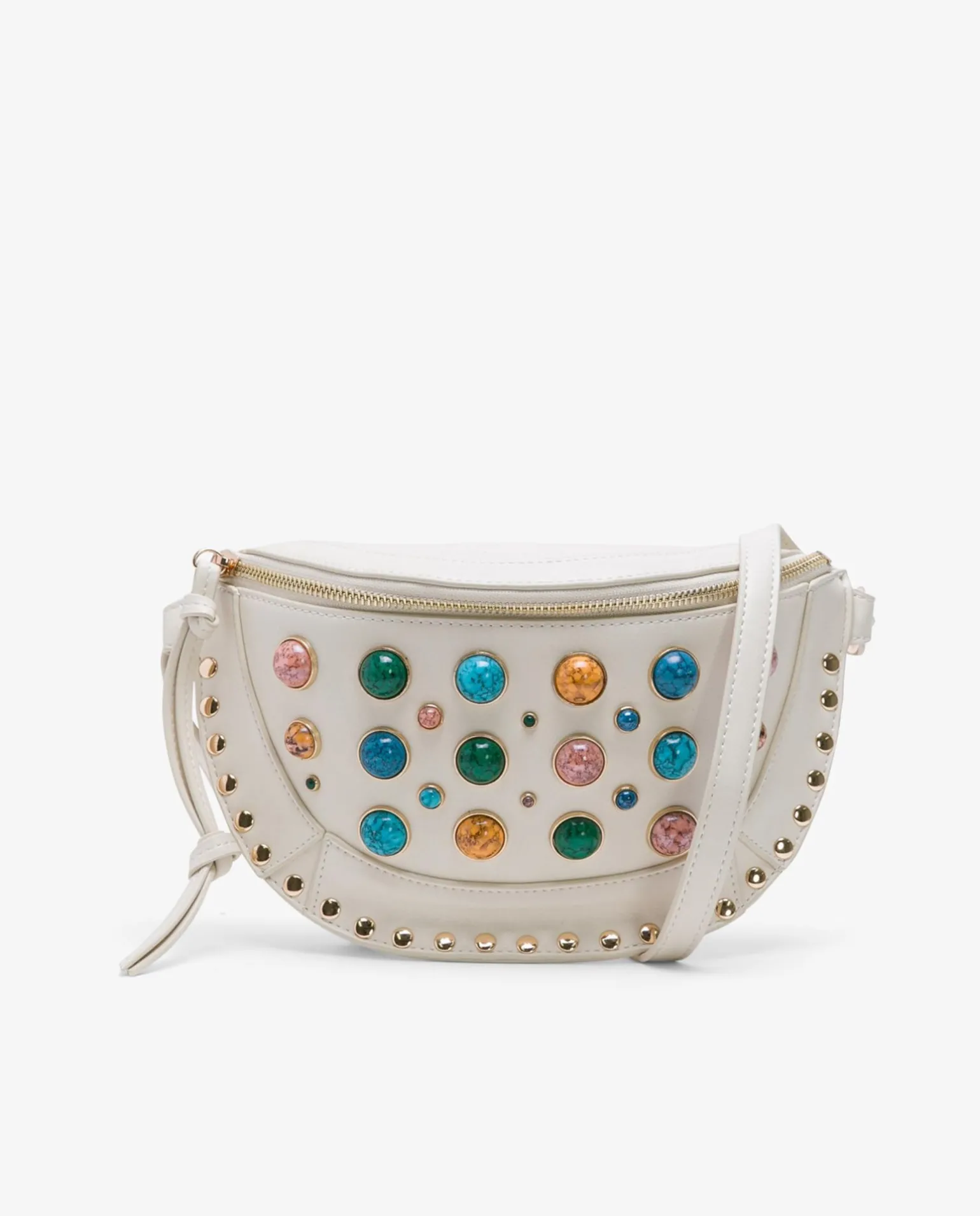 DescripciónBandolera Estilo Riñonera Blanco, Correa Estrecha, Y Decoraciones En Pedrería Y Tachuelas Doradas. Perfecto Para Elevar Los Looks Más Casuales.