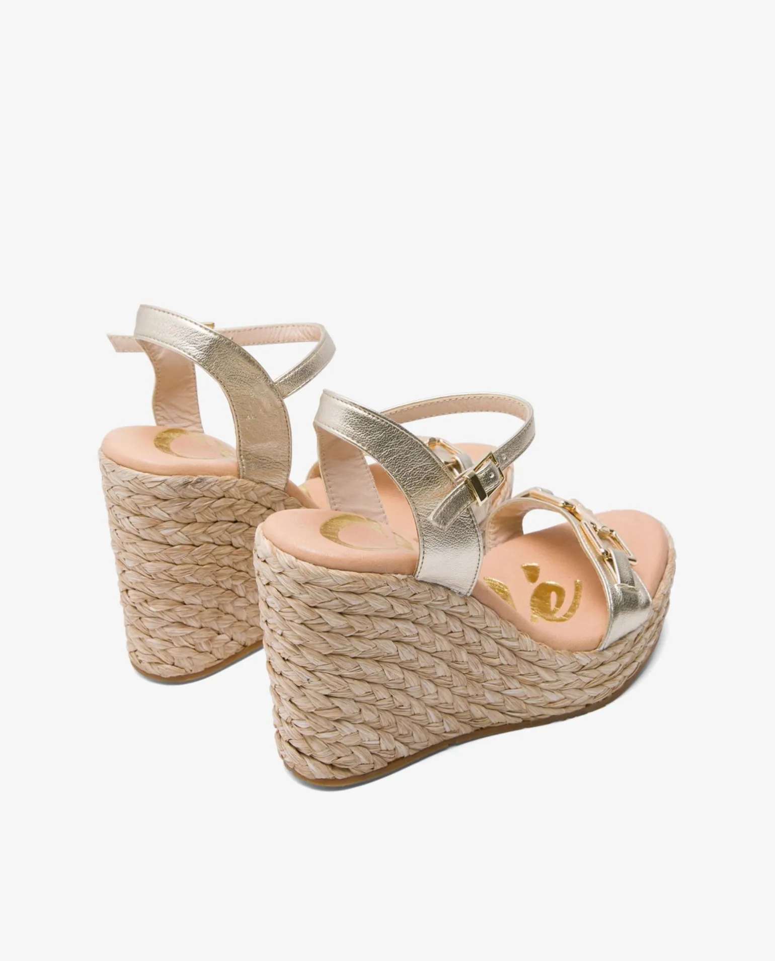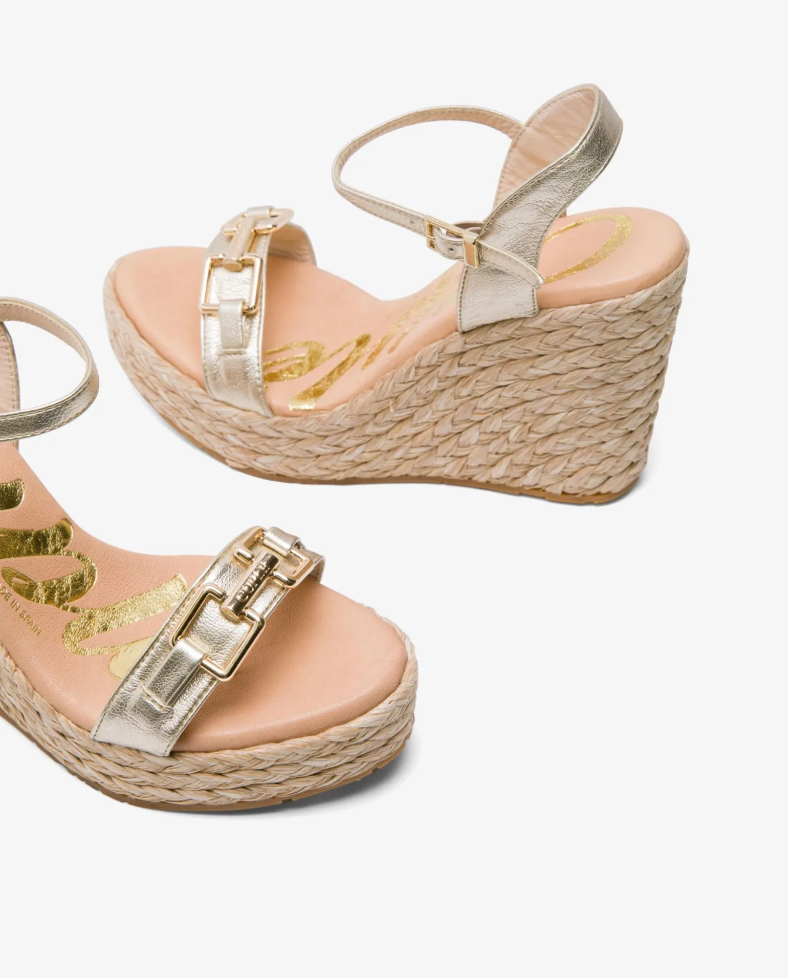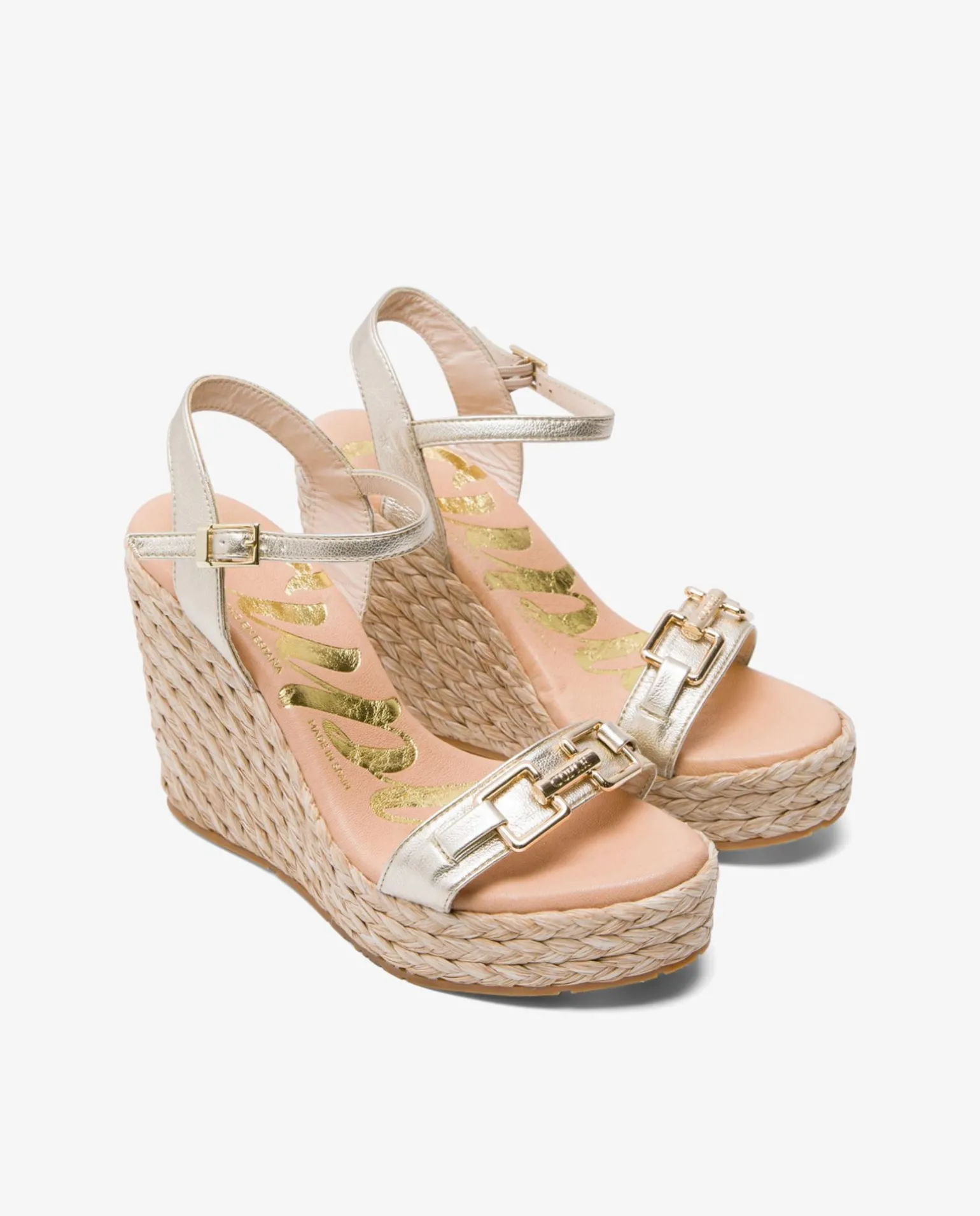 DescripciónSandalia Con Cuña Alta, Tira En La Parte Delantera En Dorado, Y Diseño De Doble Hebilla. Tiene Tira Trasera Y Cierre Con Hebilla Para Una Mejor Sujeción.