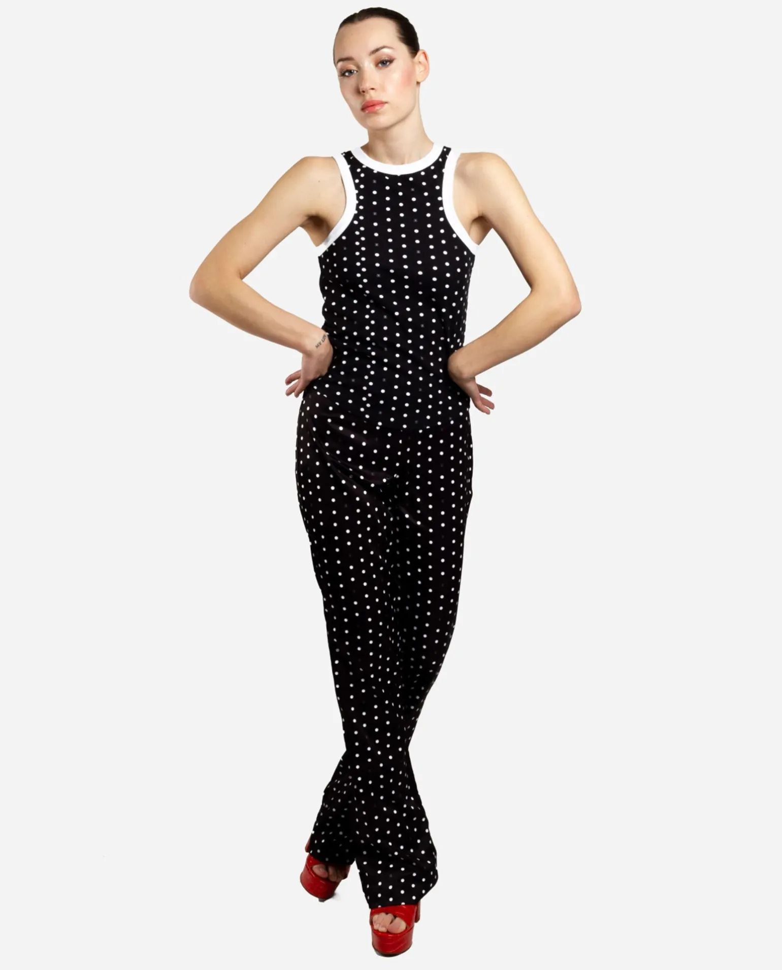DescripciónTop De Punto Con Cuello Halter Y Estampado De Lunares Blanco Y Negro Con Nuestro Logo. Combínalo Con Los Pantalones A Juego, O Crea Tu Propio Look Desde Cero.