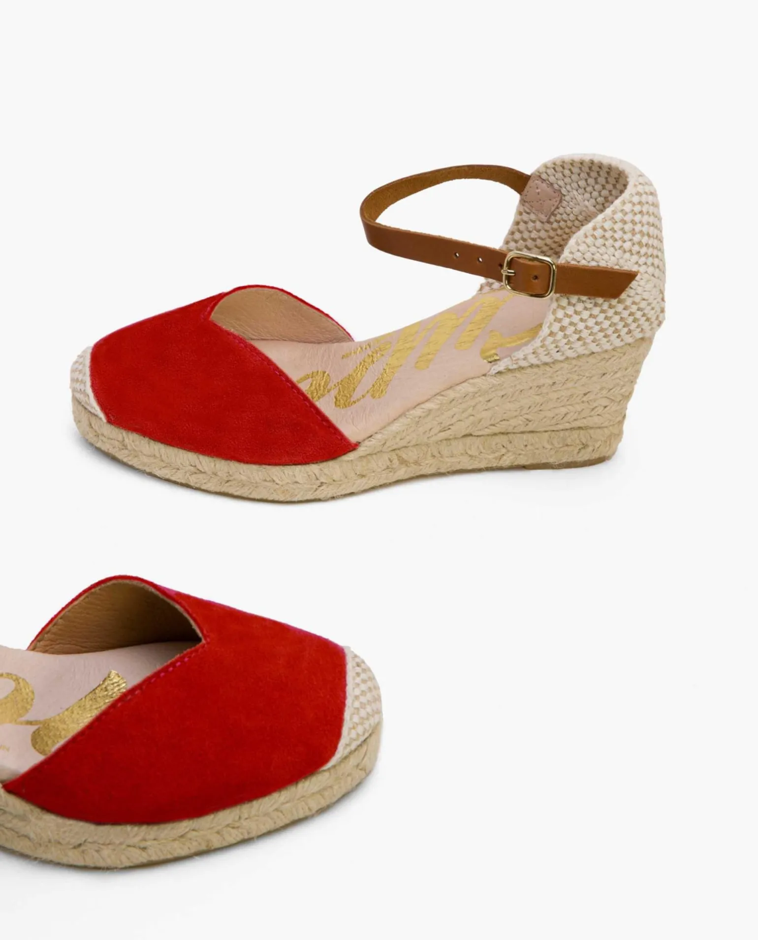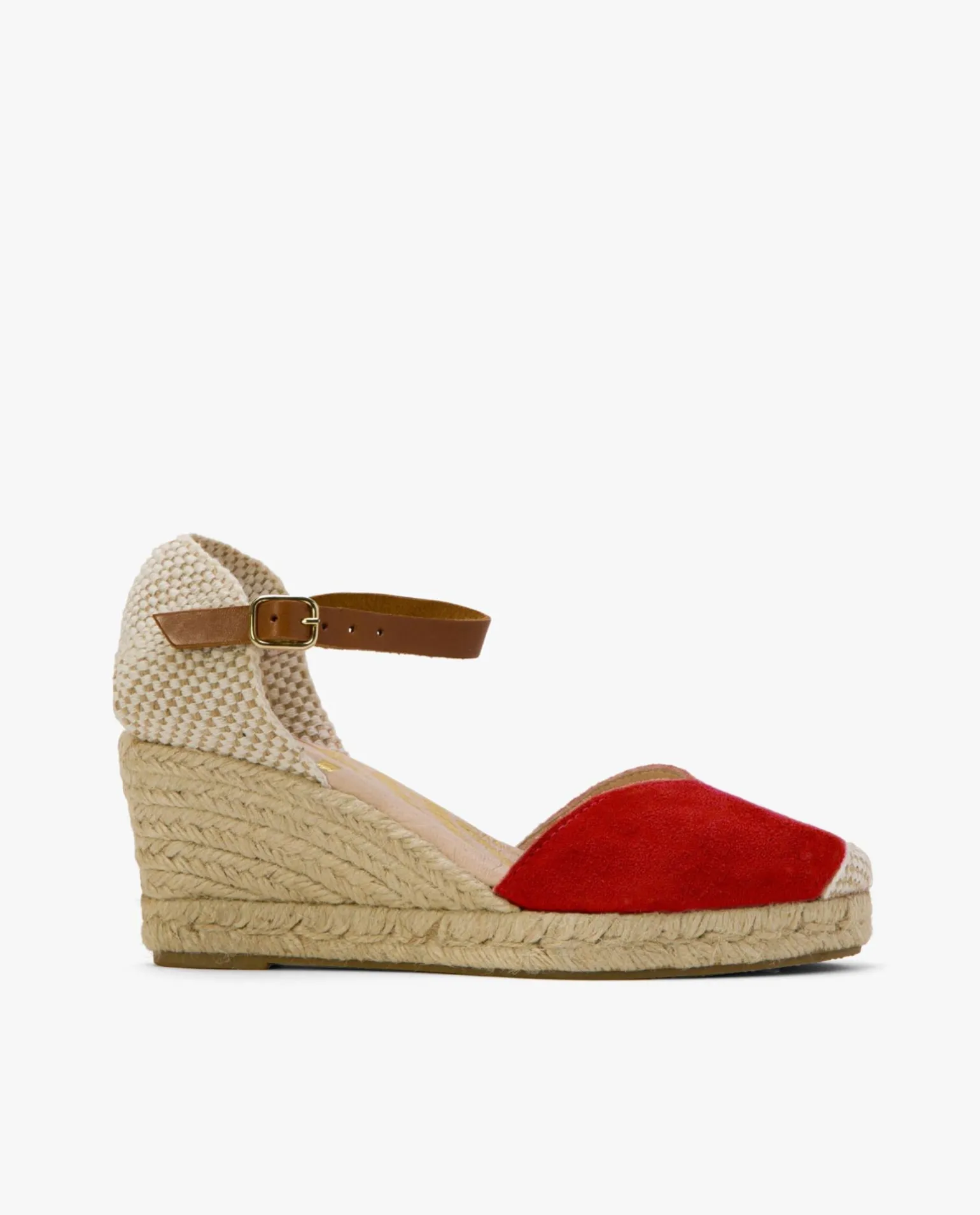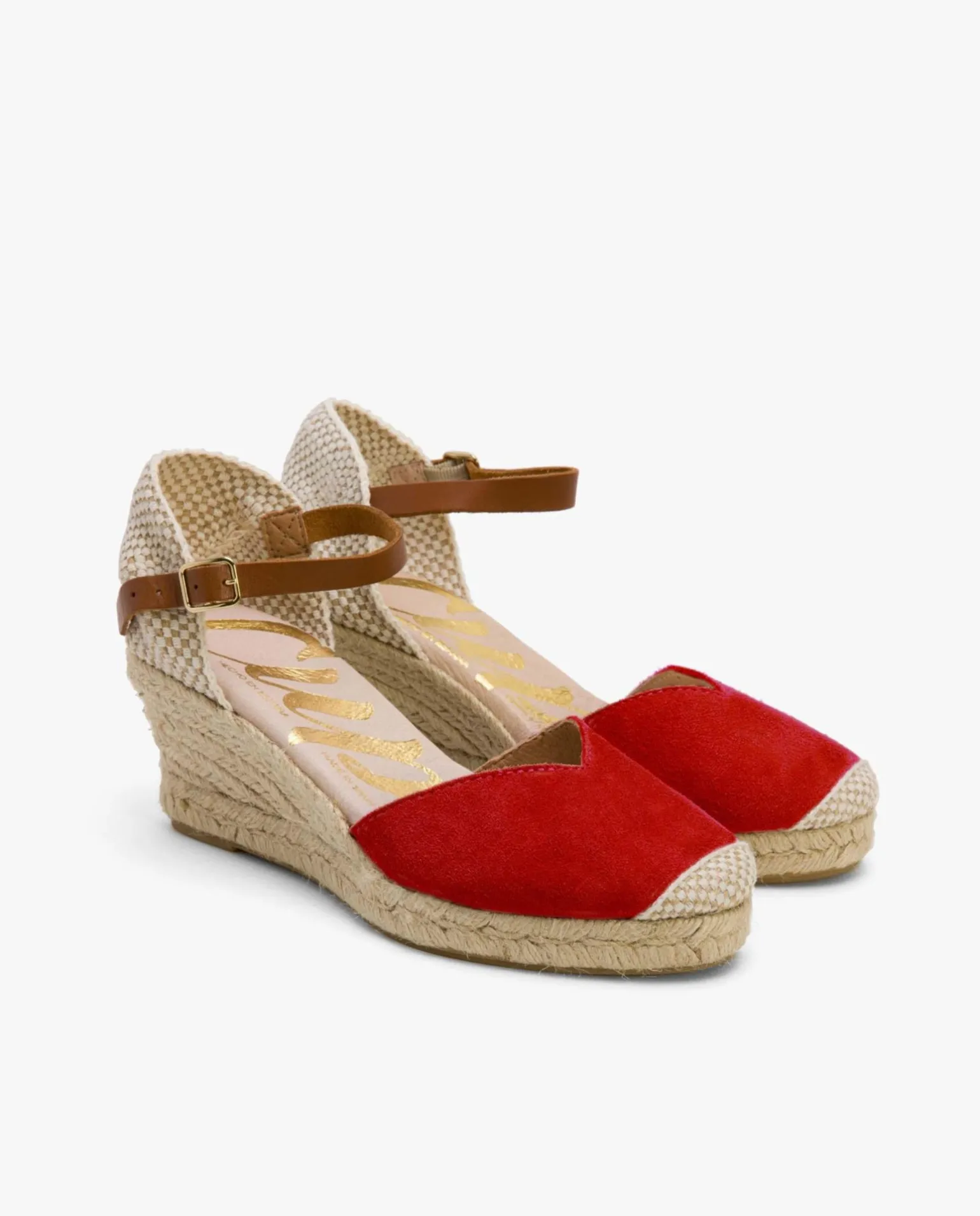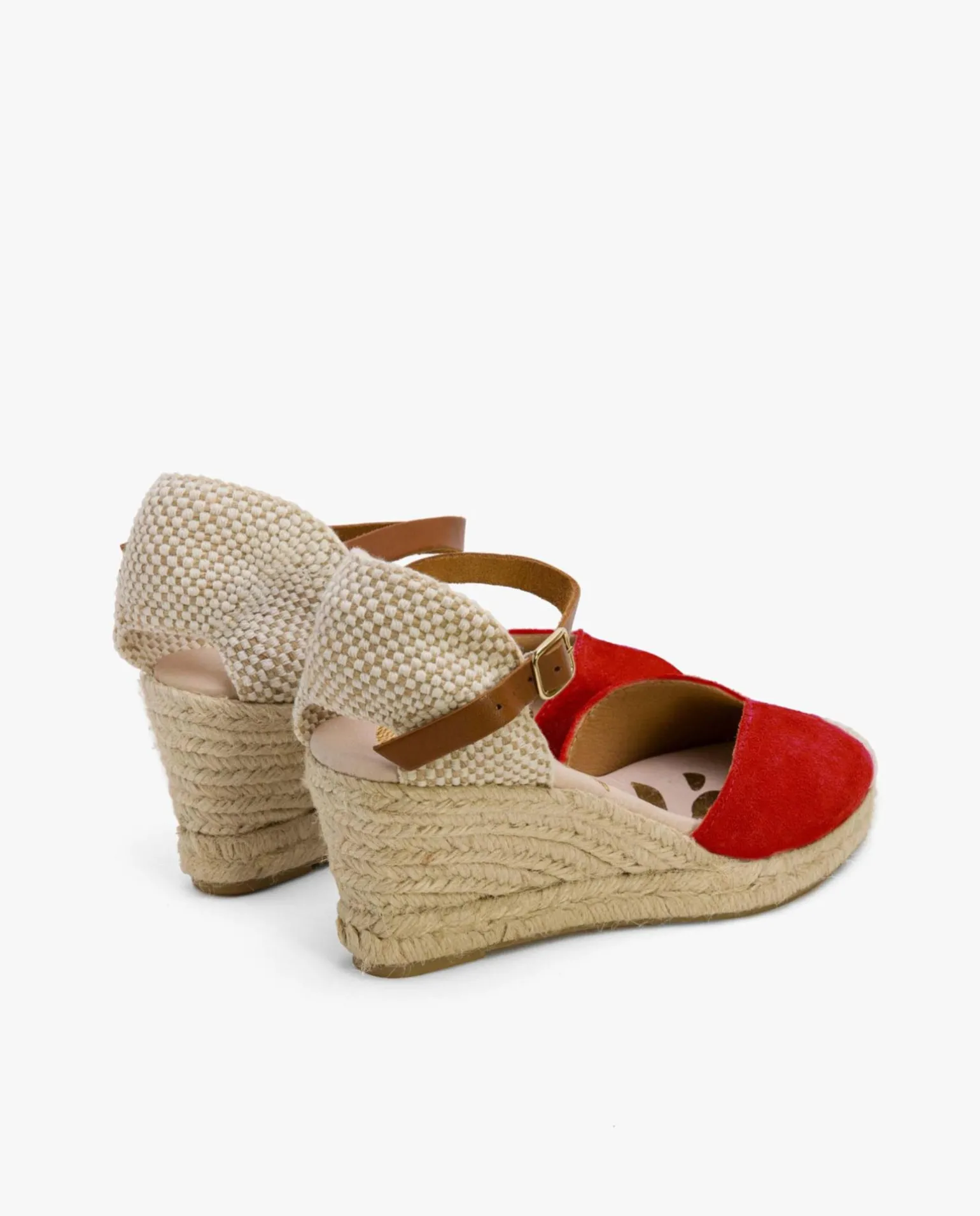 DescripciónCuña En Yute, Con Pulsera. Parte Delante En Serraje Color Rojo.