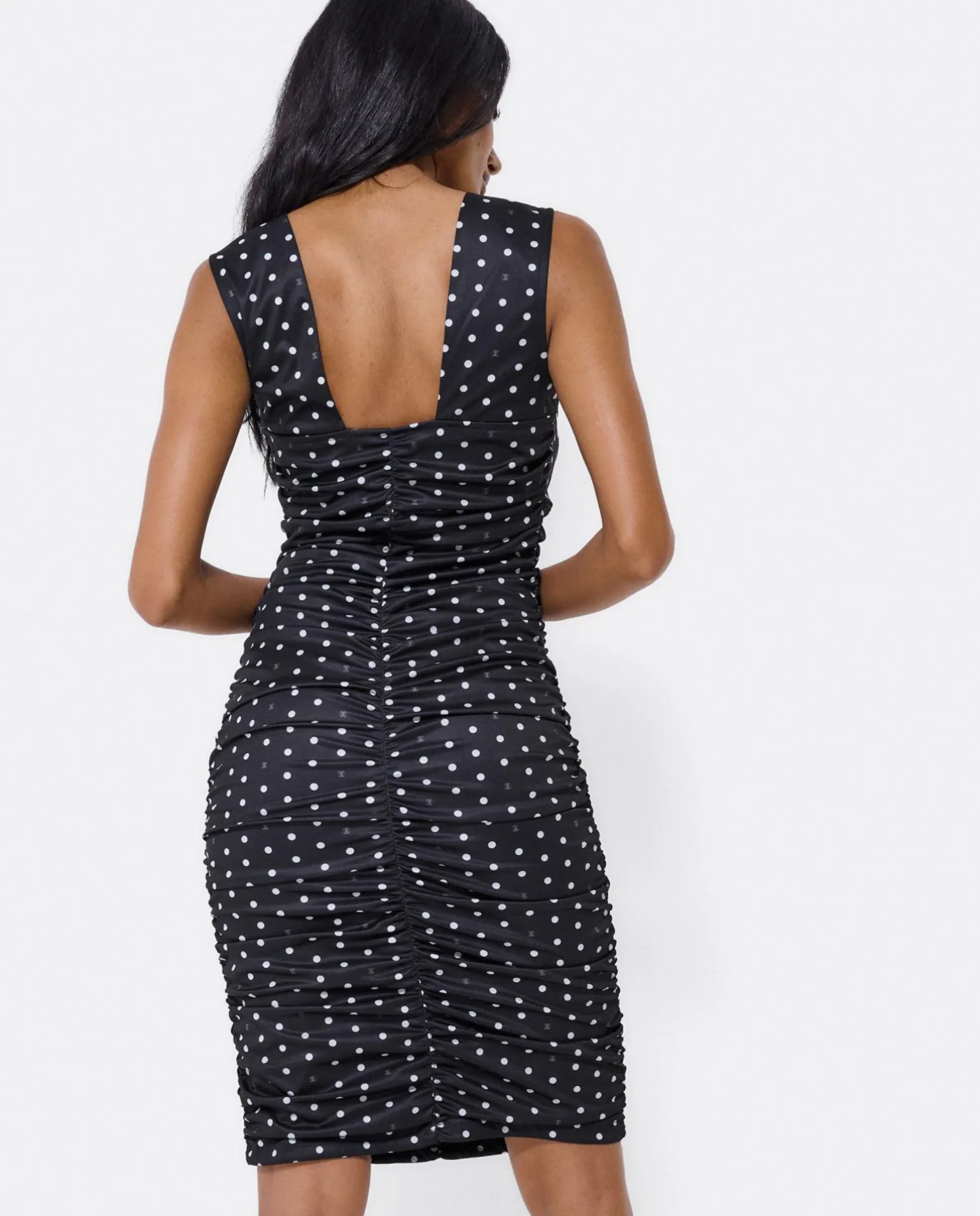 DescripciónMini Vestido Drapeado Escote De Corazón De Tirantes Estampado De Lunares Con Logo Cuplé Con Cremallera Lateral Invisible.
