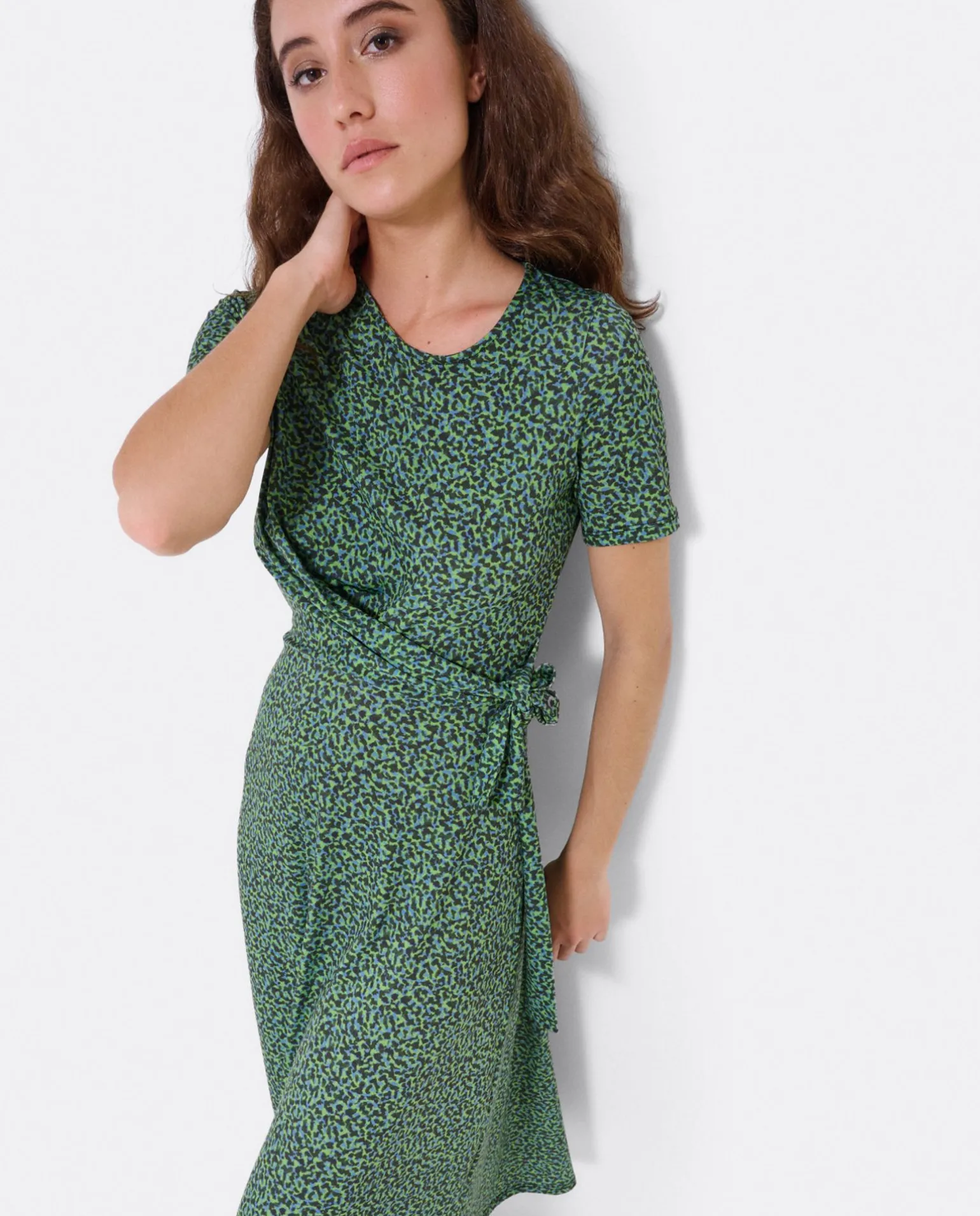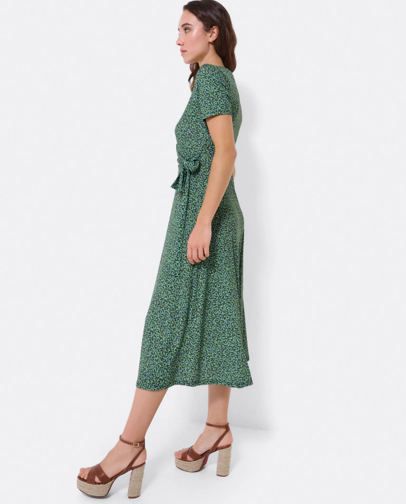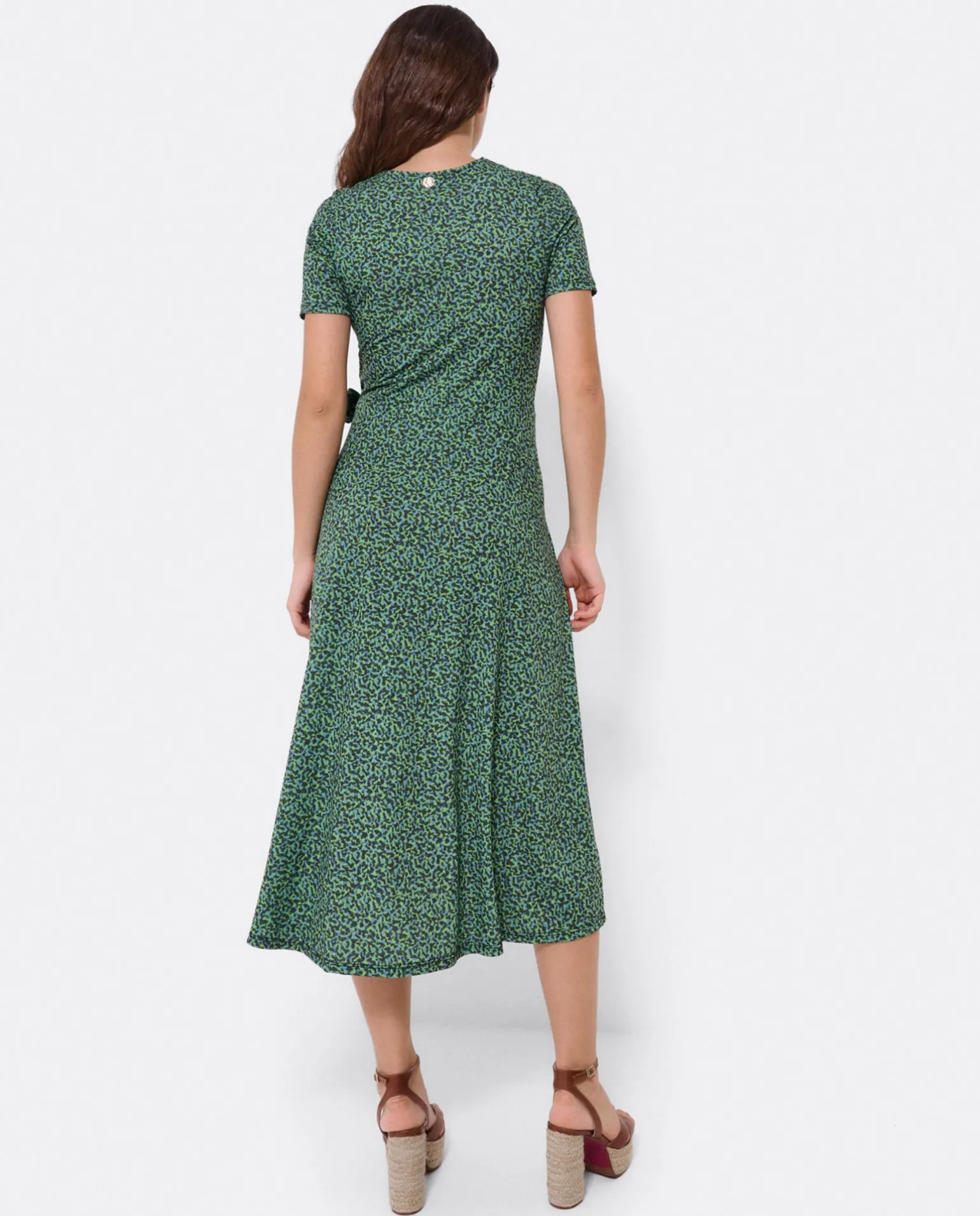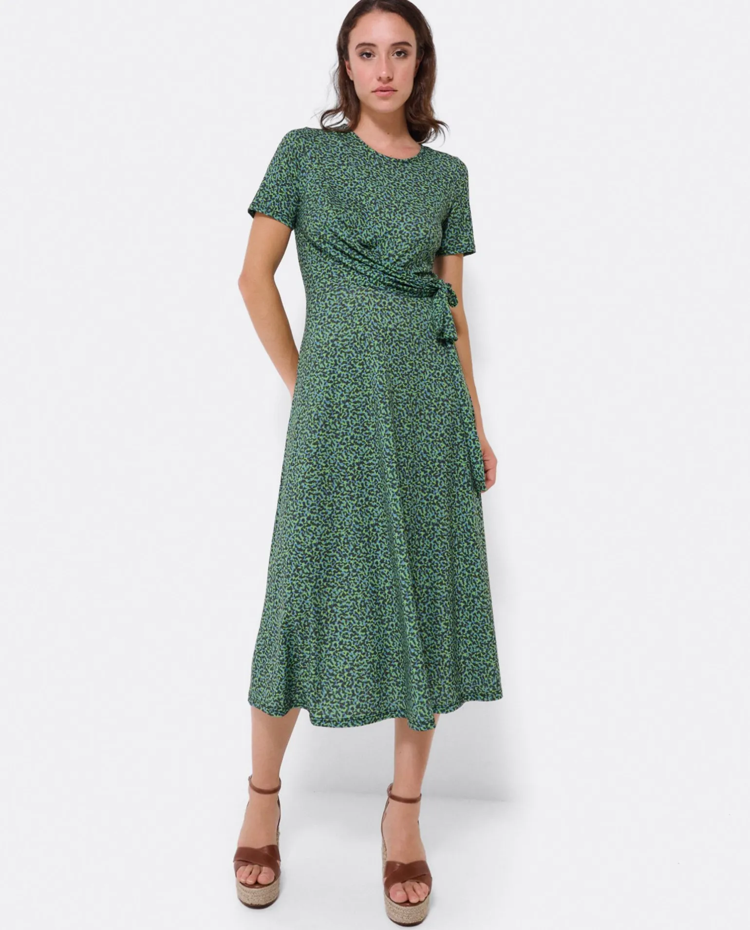 DescripciónVestido Midi, Con Detalle De Nudo En La Parte Lateral. Su Estampado En Leopardo Verde Lo Hace Ideal Para La Temporada De Primavera – Verano.