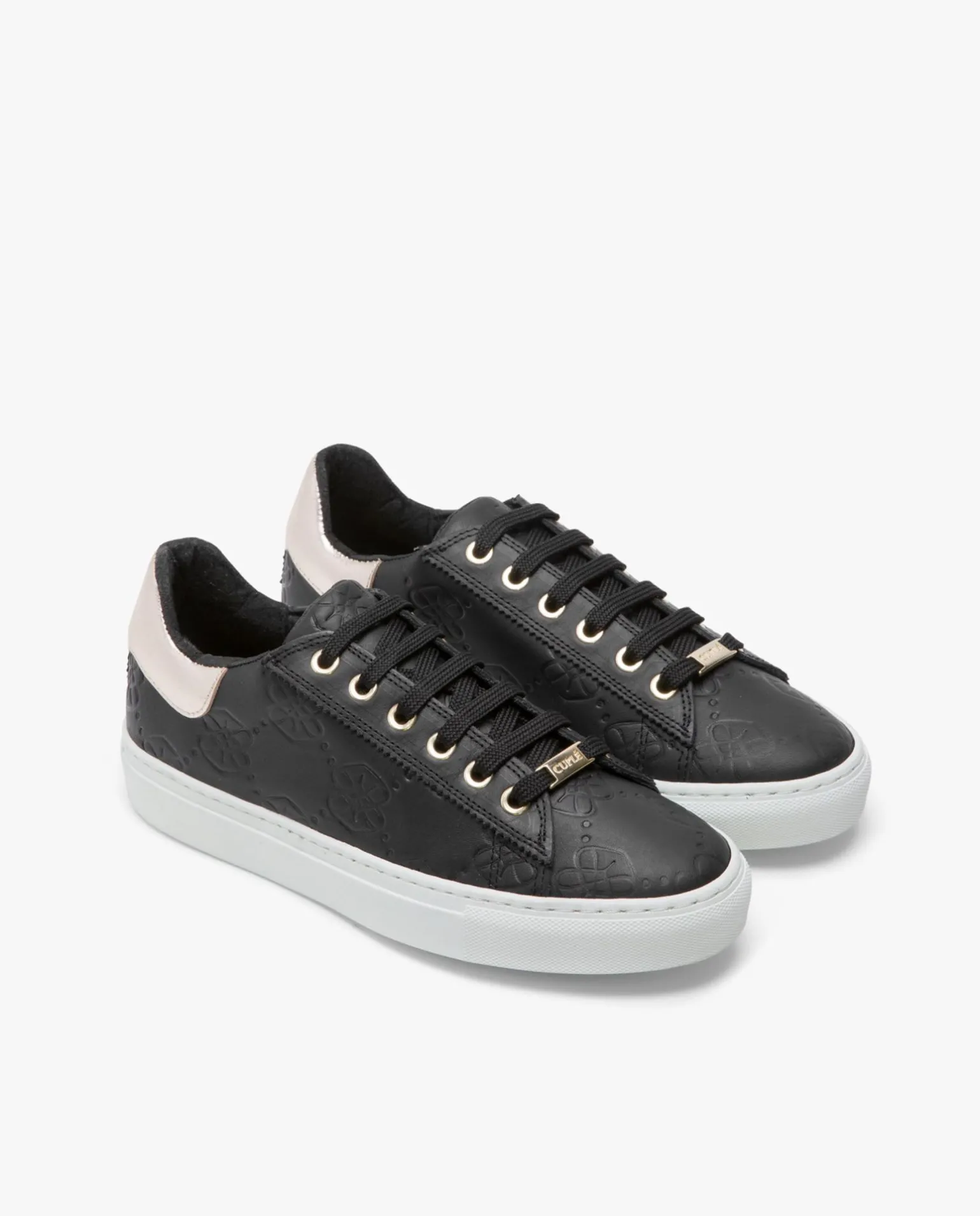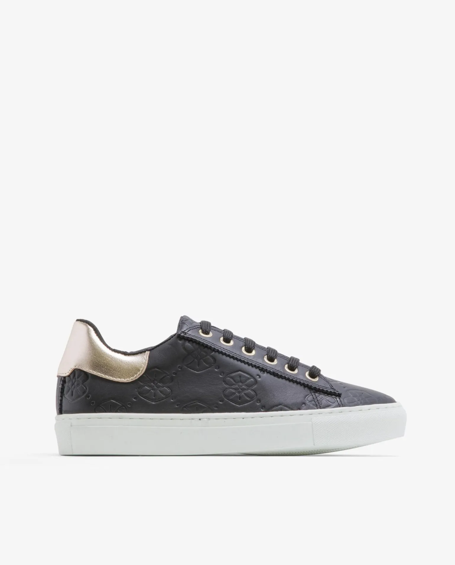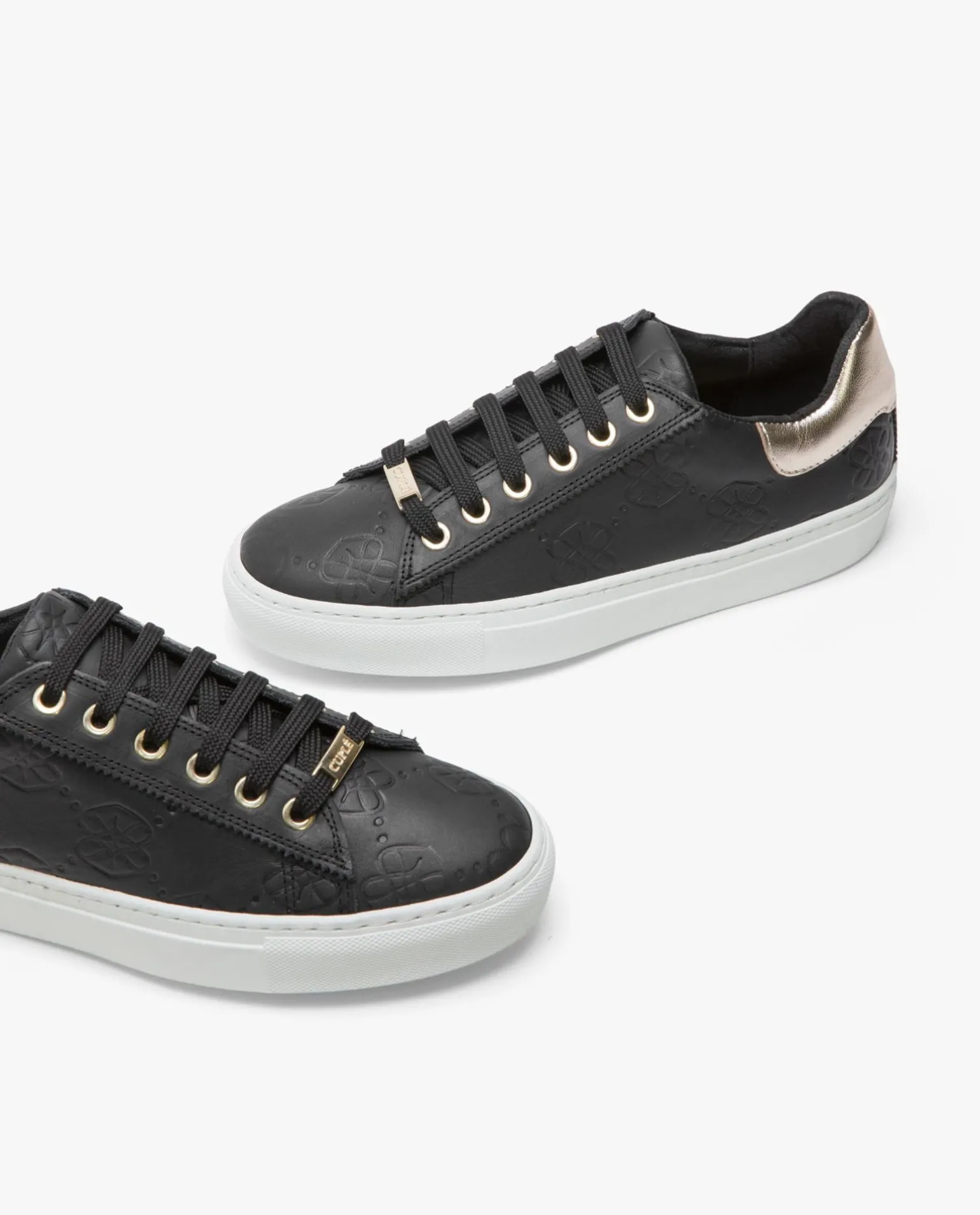 DescripciónZapatillas En Piel Color Negro, Con Toques Dorados. Diseño De Logos Repujados.