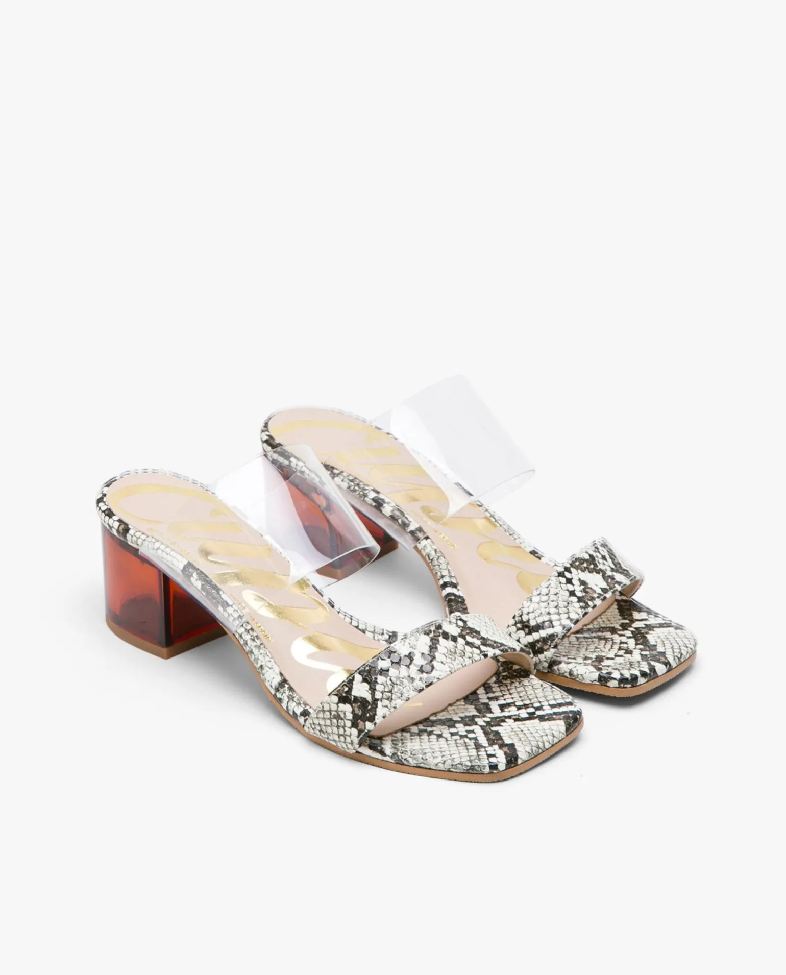 DescripciónZueco Con Tacón Medio, Tira Gruesa En Vinilo Y Tira Delgada En Estampado Serpiente. Con Tonos Grises Y Negros.