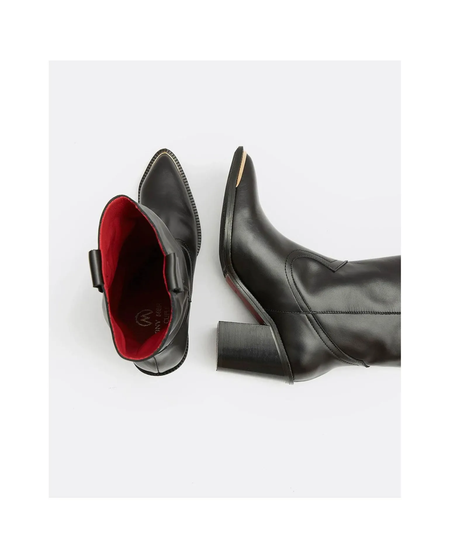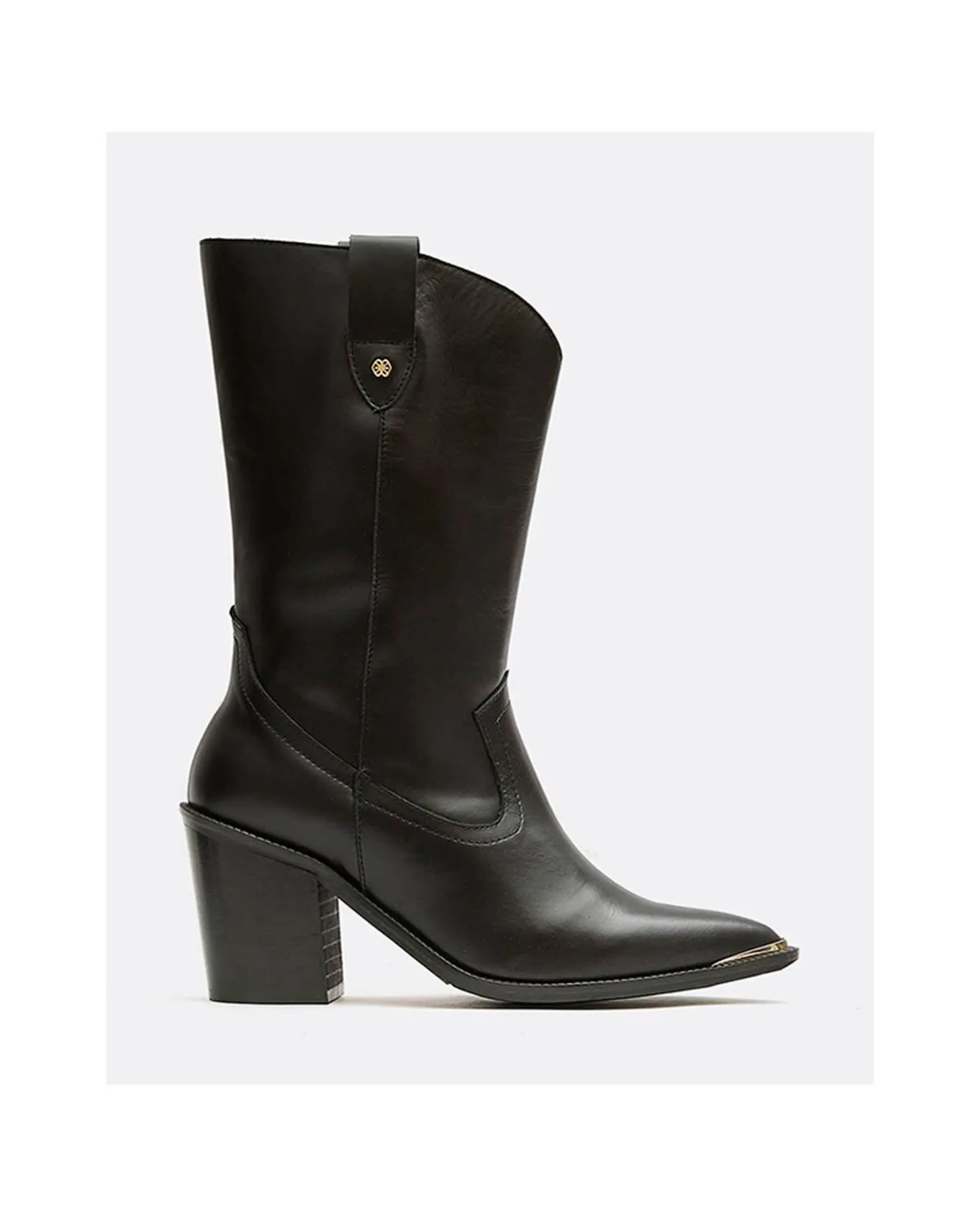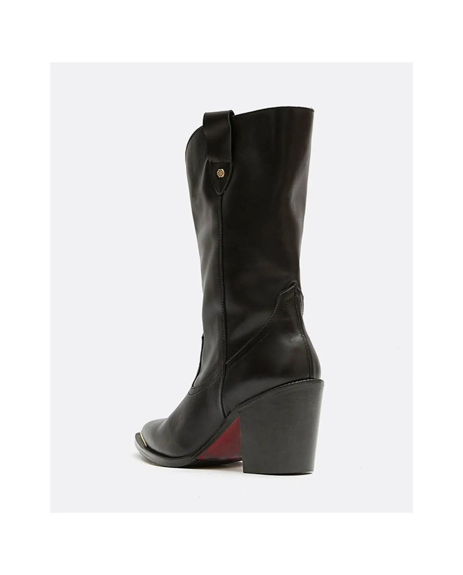 Bota Estilo Cowboy En Piel Color Negro. Tacón Medio Y Caña Media.