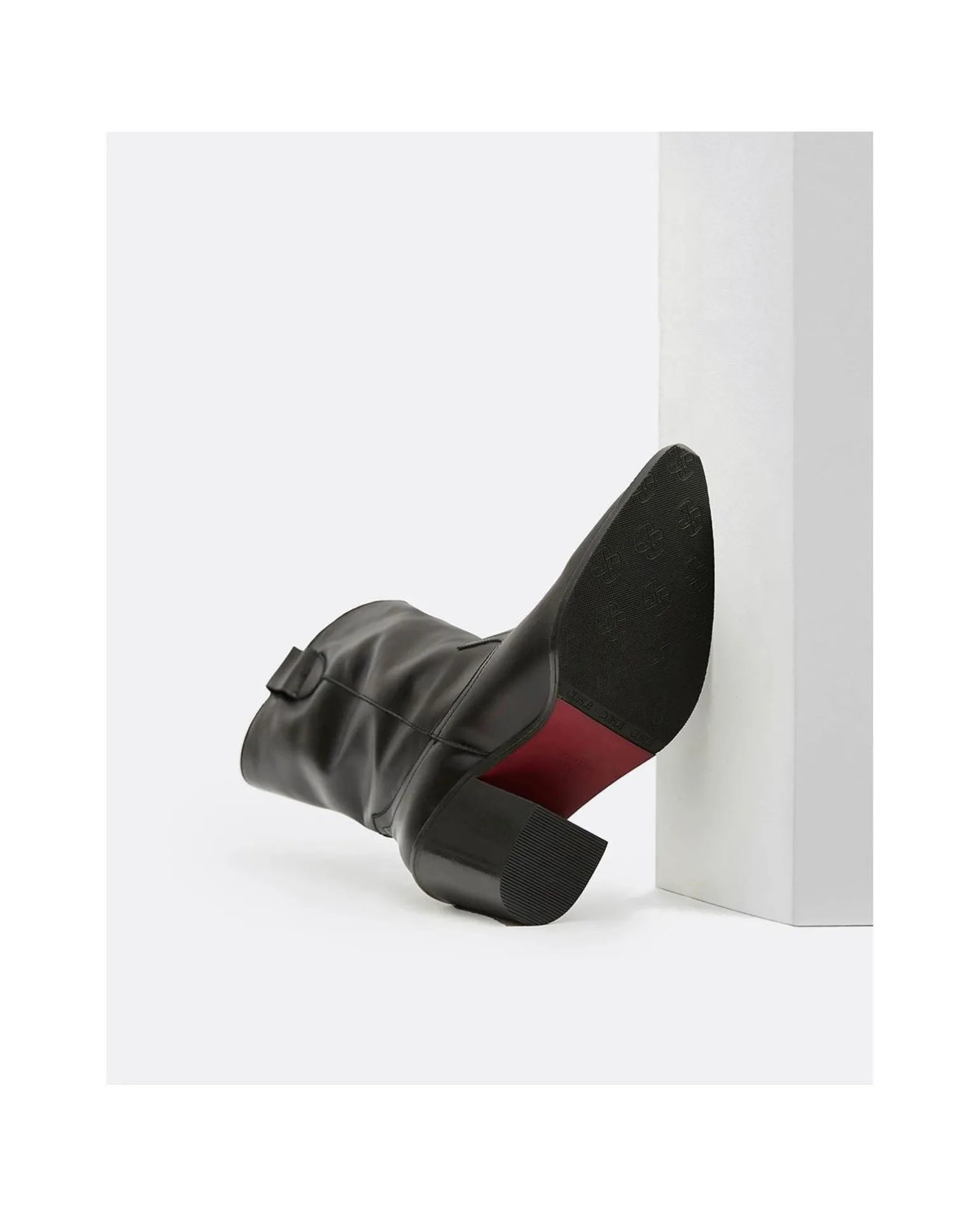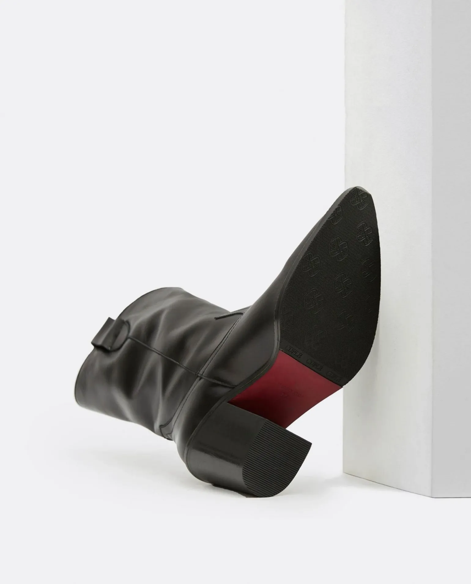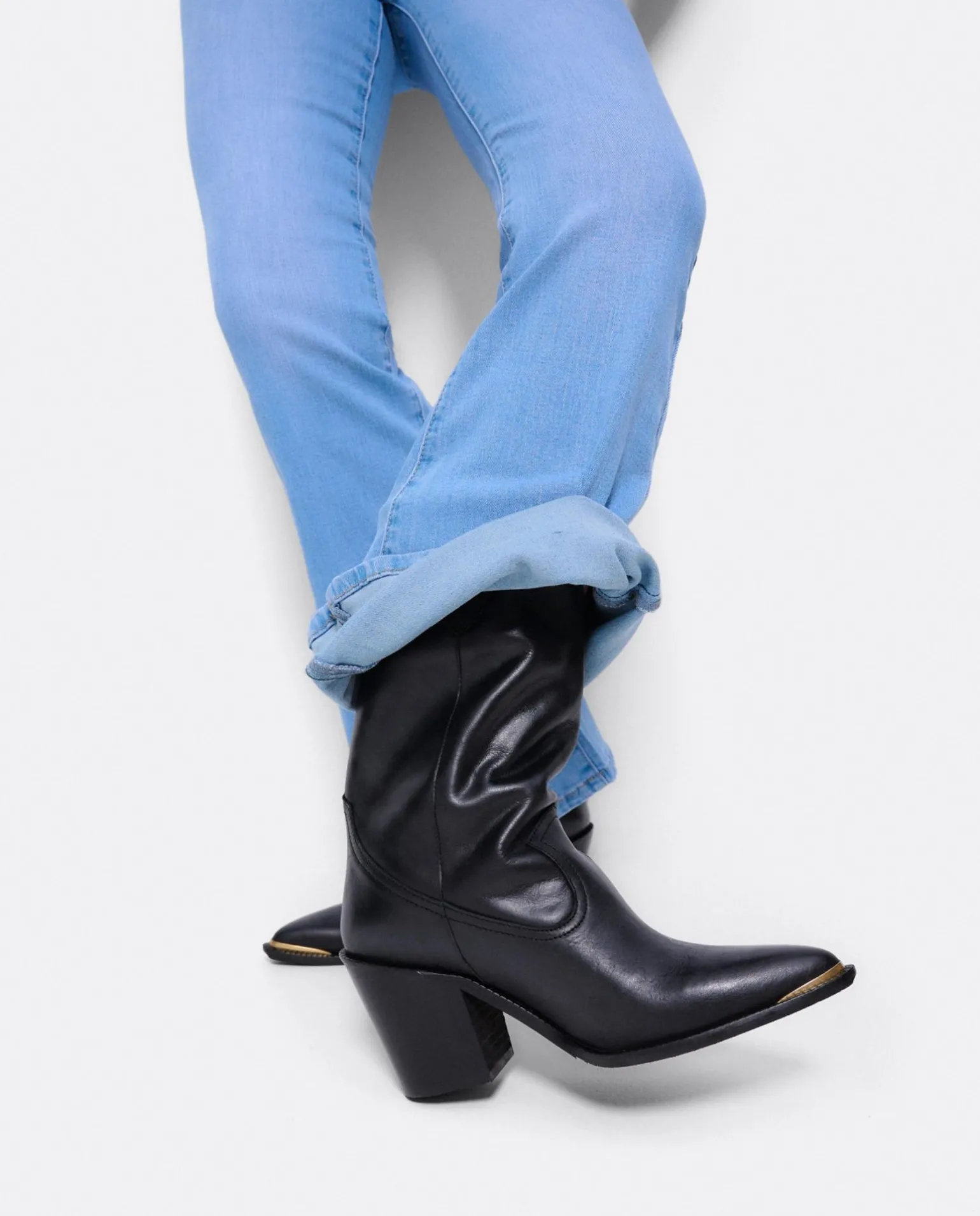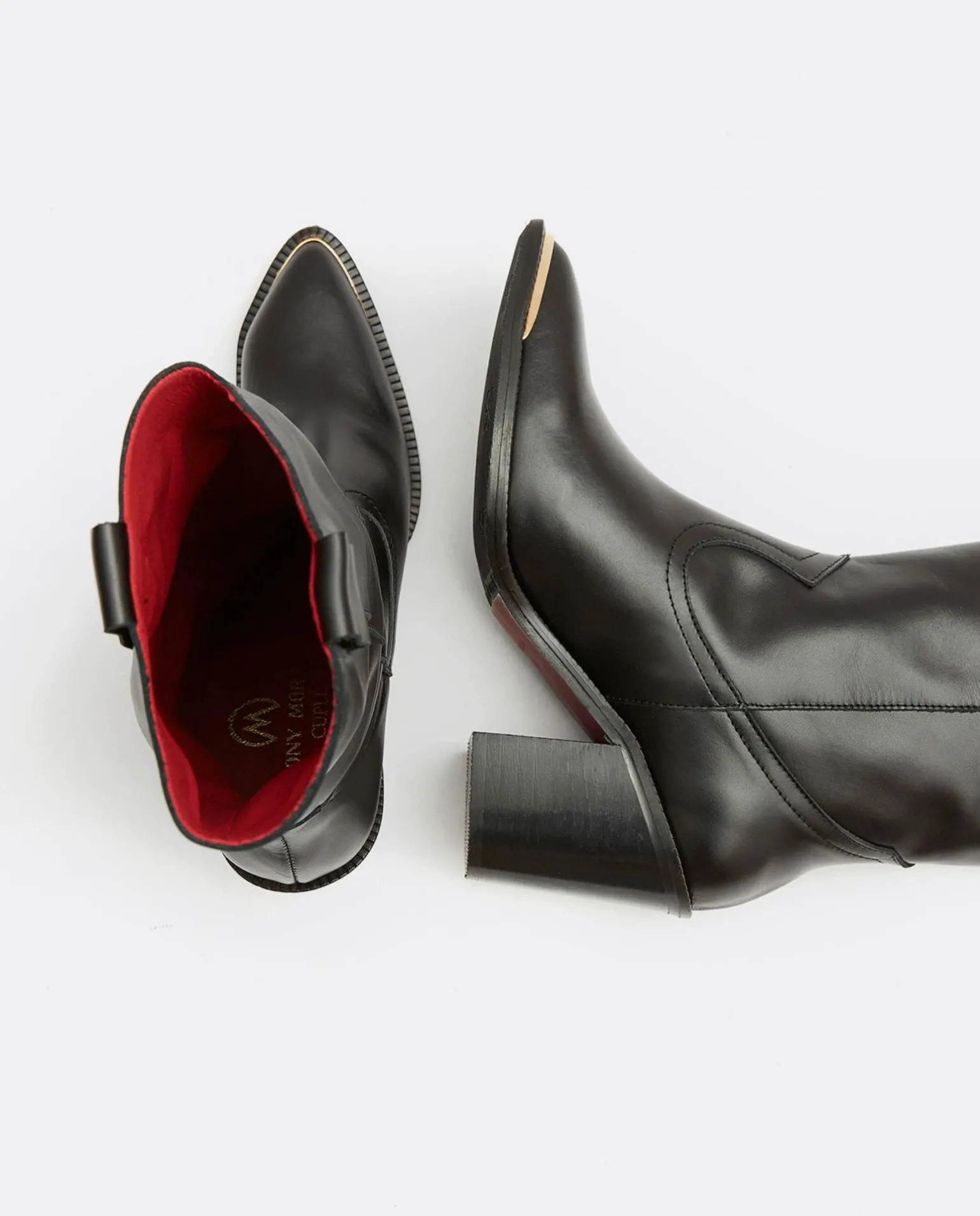 Bota Estilo Cowboy En Piel Color Negro. Tacón Medio Y Caña Media.