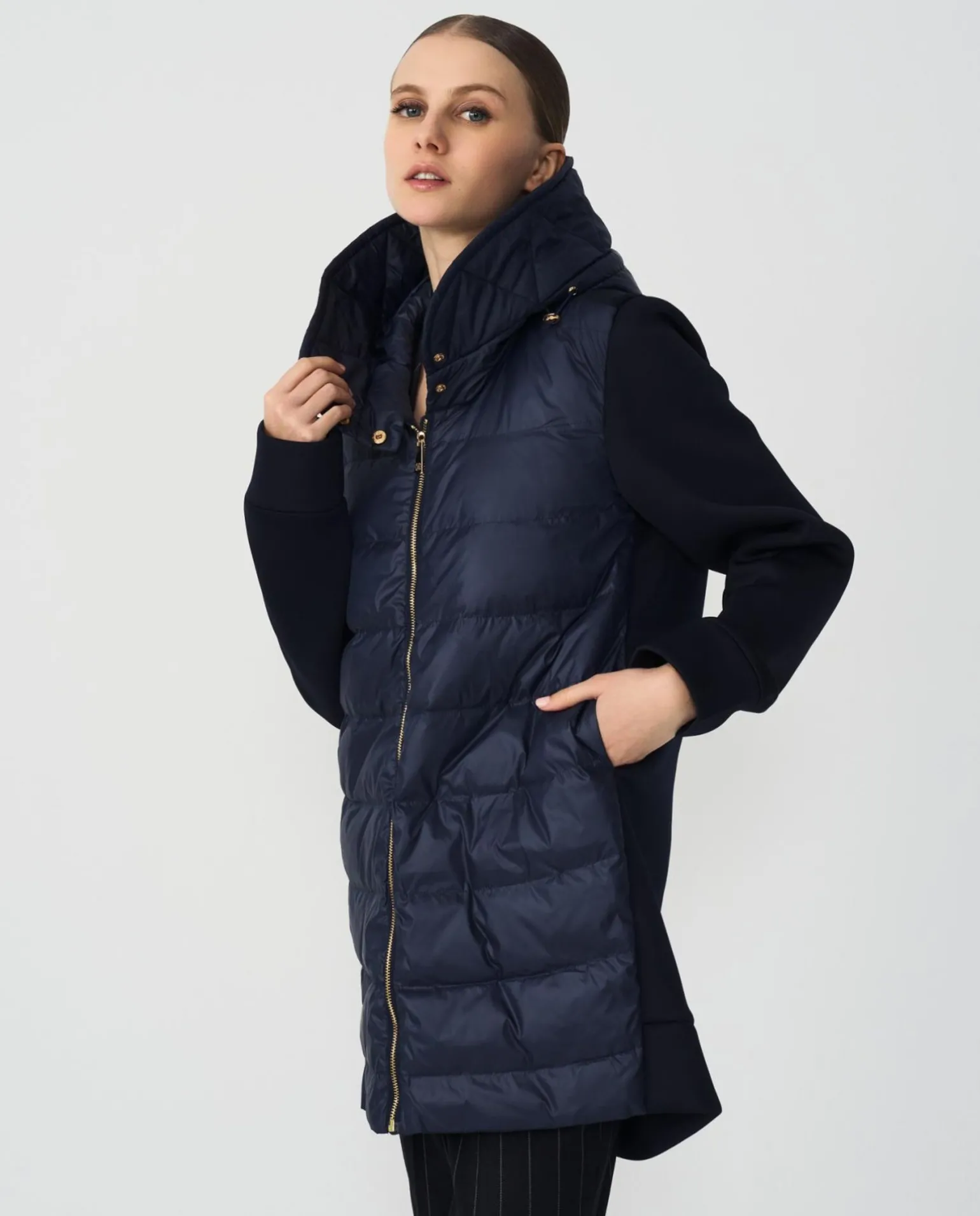 DescripciónChaqueta Neoprenotres Cuartos En Color Azul Marino, Con Bolsillos Laterales, Capucha Y Cierre Con Cremallera. Se Presenta Como La OpciÓN Ideal Con La Que Combinar Nuestros BÁSicos De Fondo De Armario.Detalles Del Producto