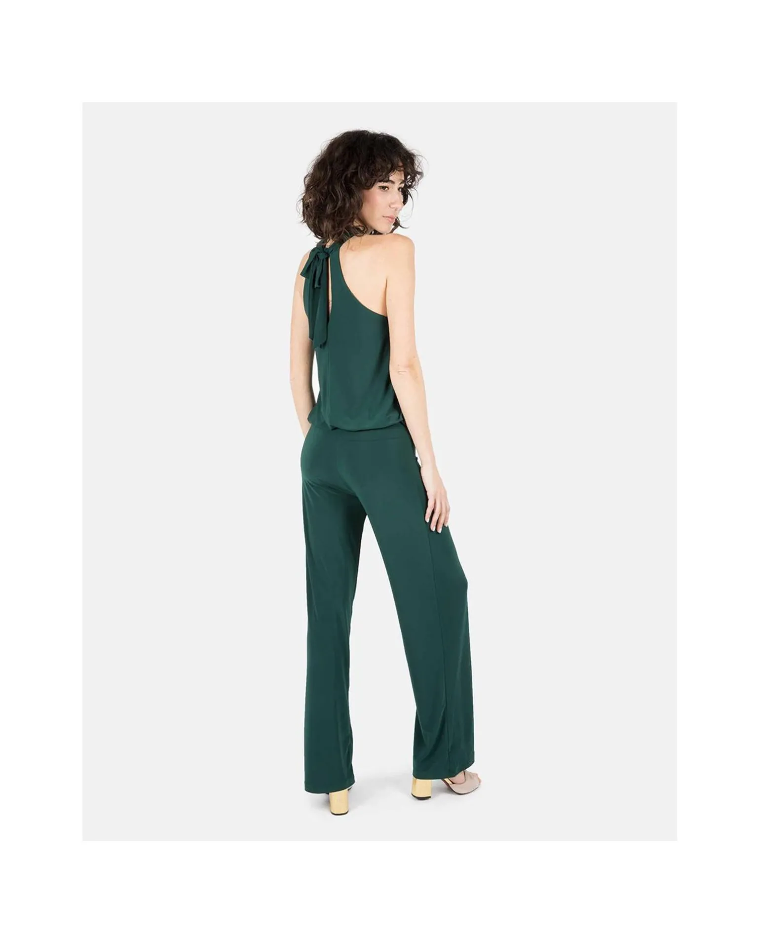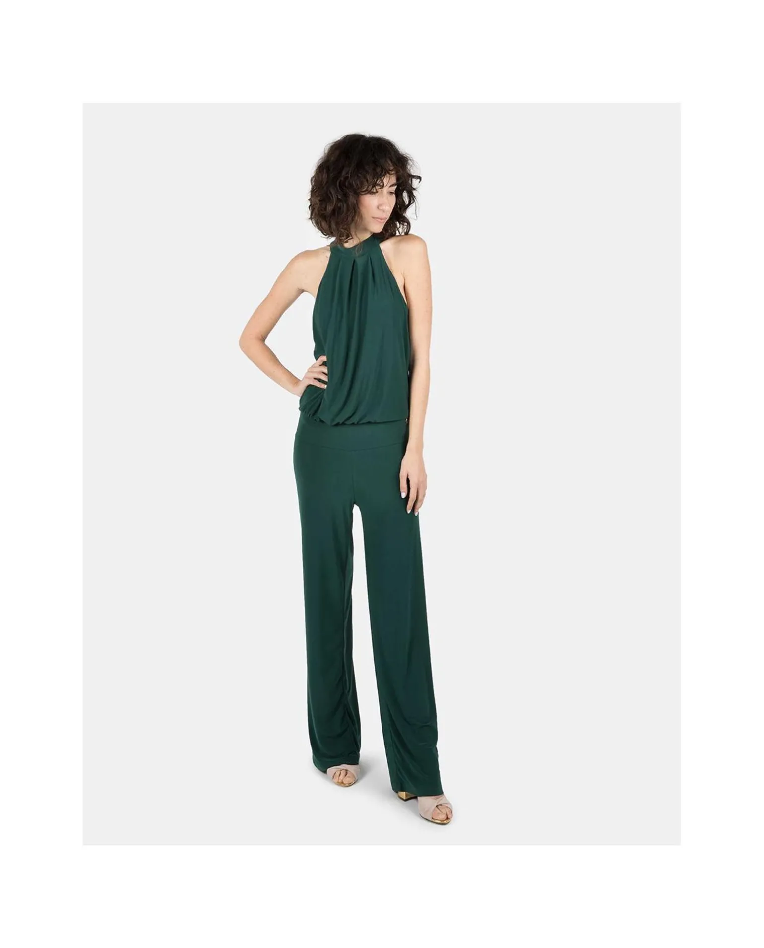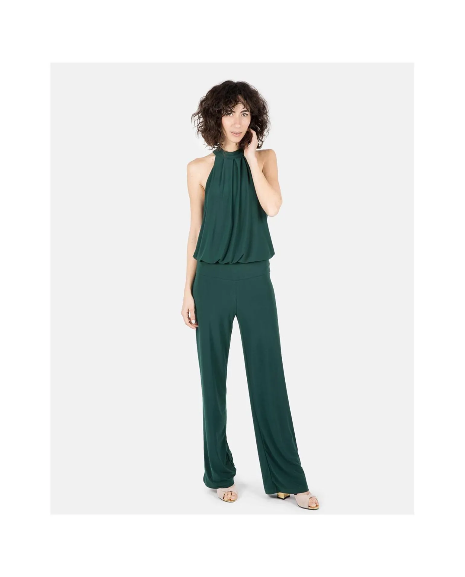 Mono Largo De Color Verde, Sin Mangas Y Cuello Halter. Su Espectacular Ajuste En La Cintura, Permitirá Una Ilusión Óptica De Llevar Dos Piezas De Ropa. Su Sencillez Y Elegancia Es Perfecta Para Una Ocasión Especial.