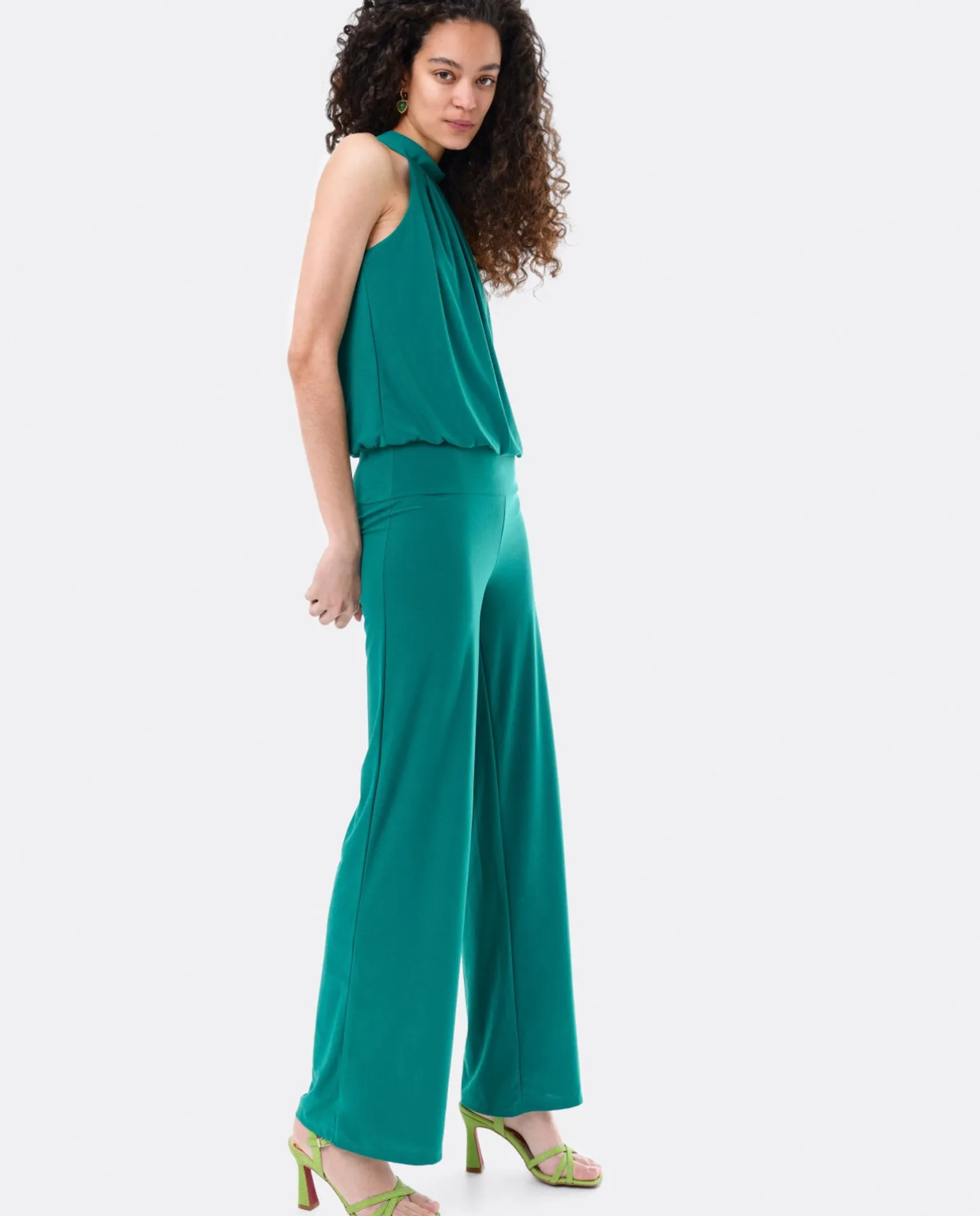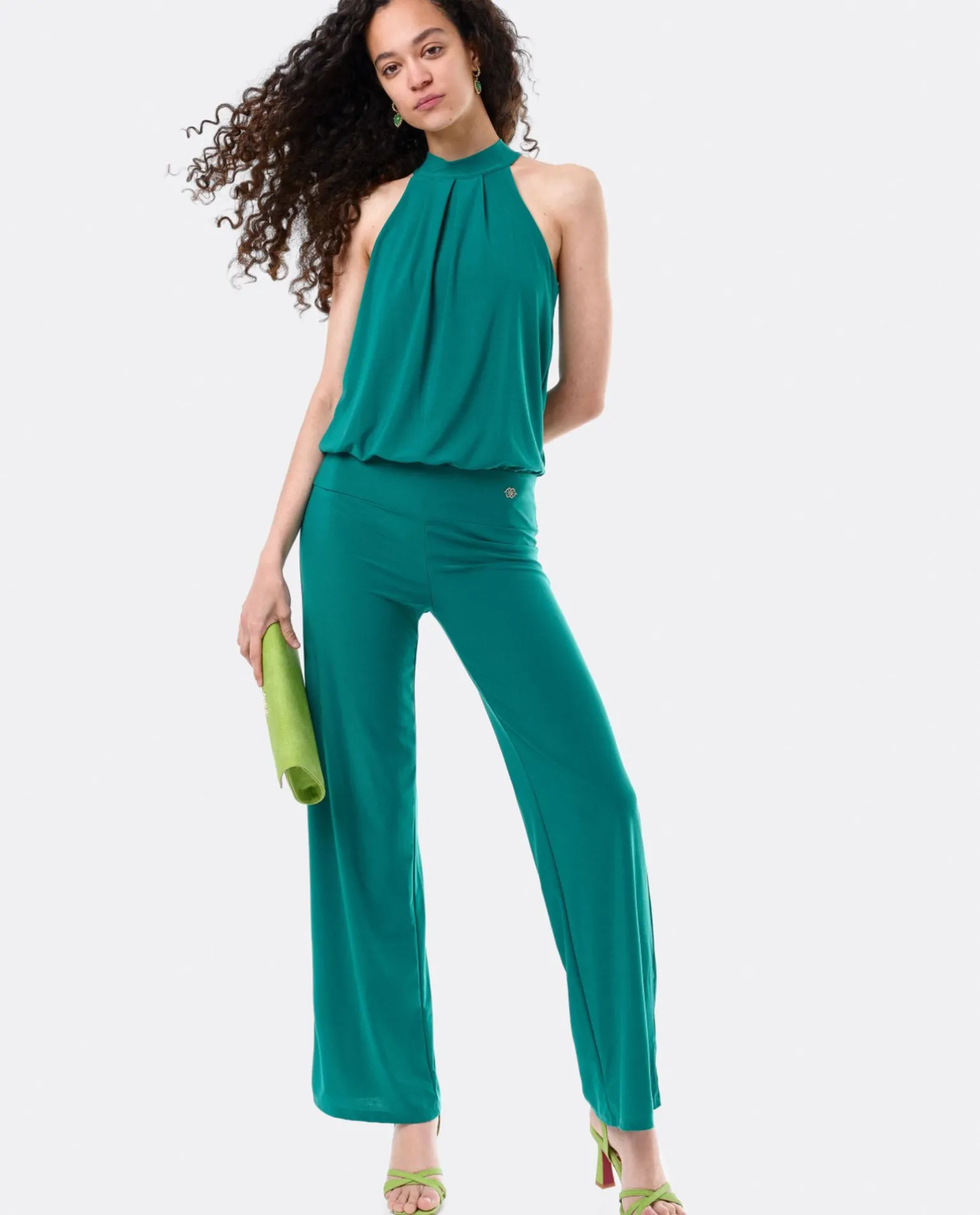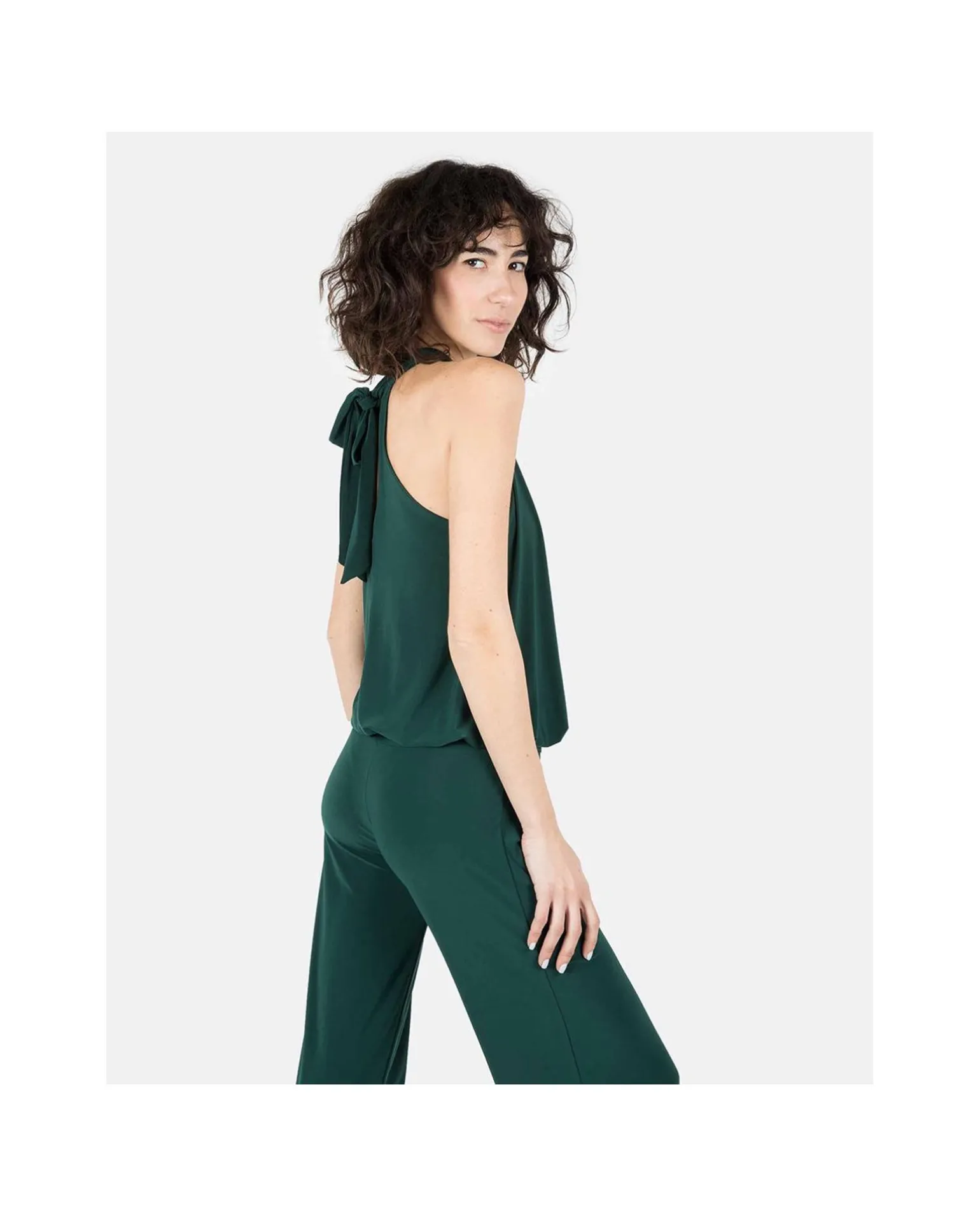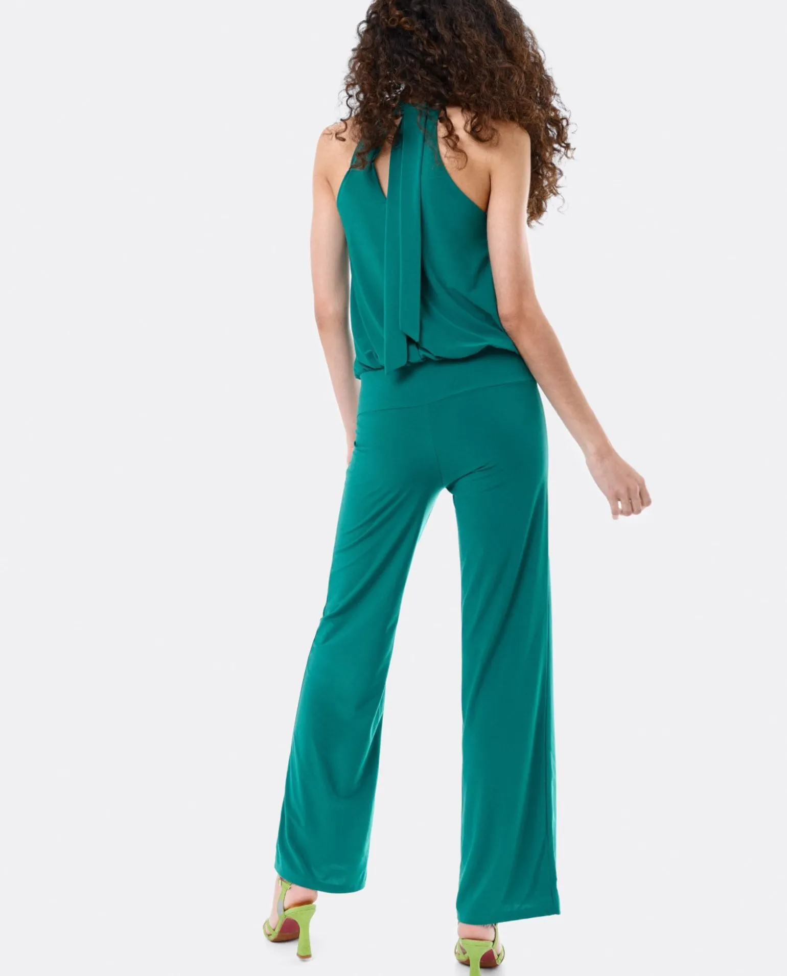 Mono Largo De Color Verde, Sin Mangas Y Cuello Halter. Su Espectacular Ajuste En La Cintura, Permitirá Una Ilusión Óptica De Llevar Dos Piezas De Ropa. Su Sencillez Y Elegancia Es Perfecta Para Una Ocasión Especial.