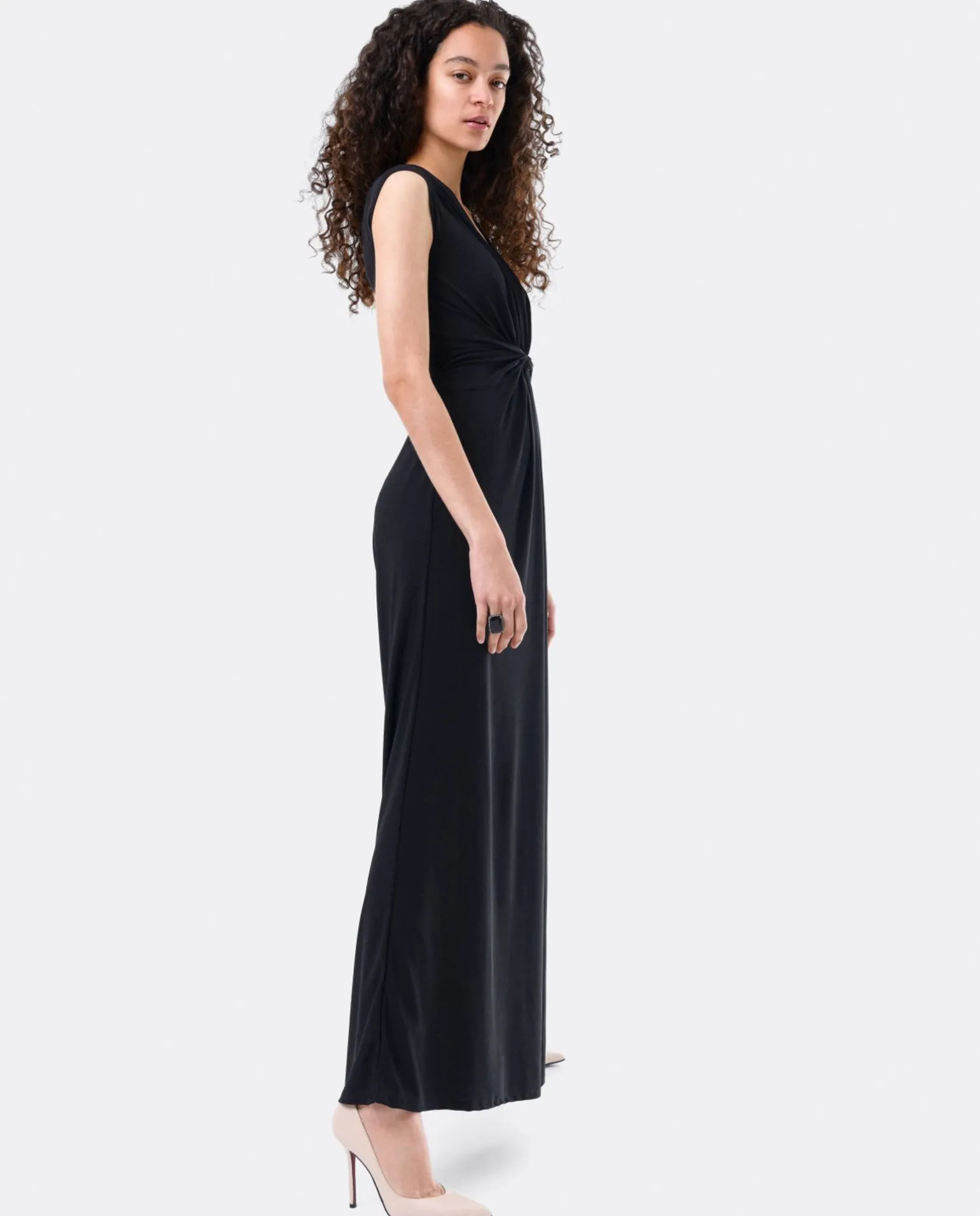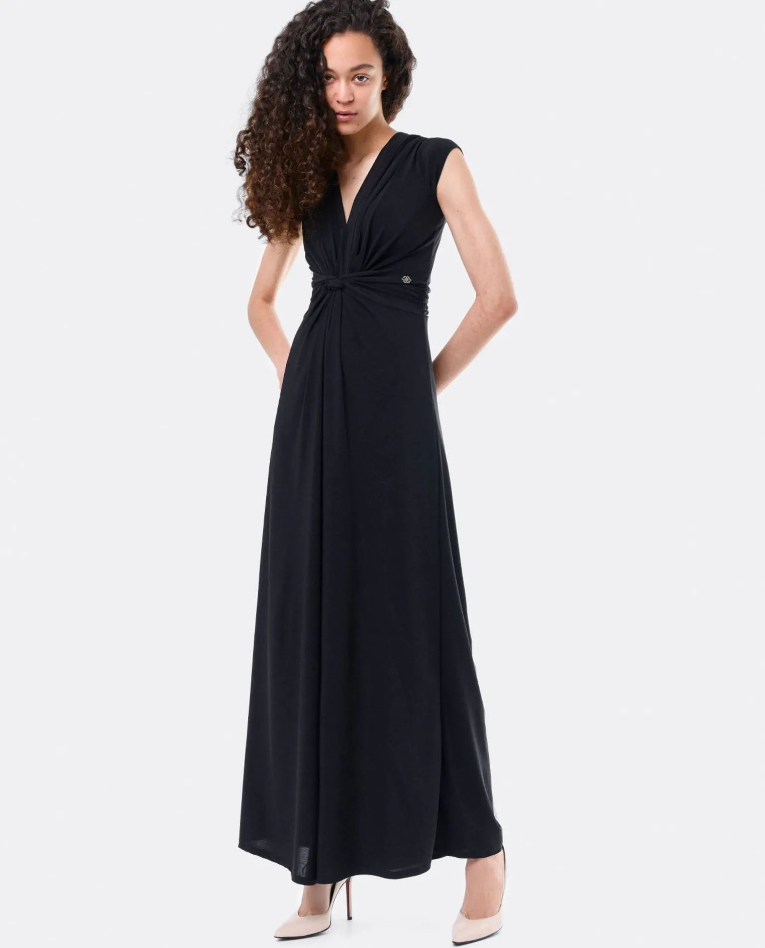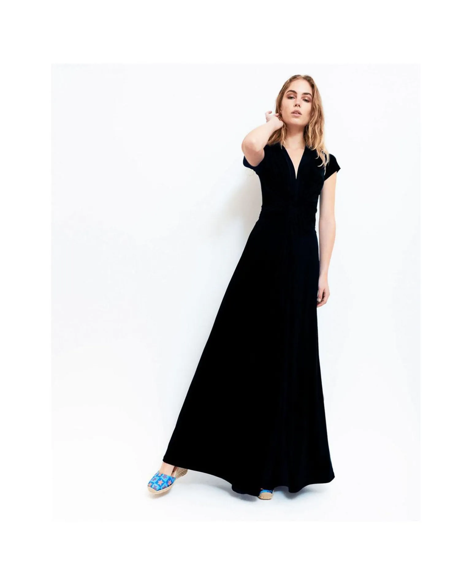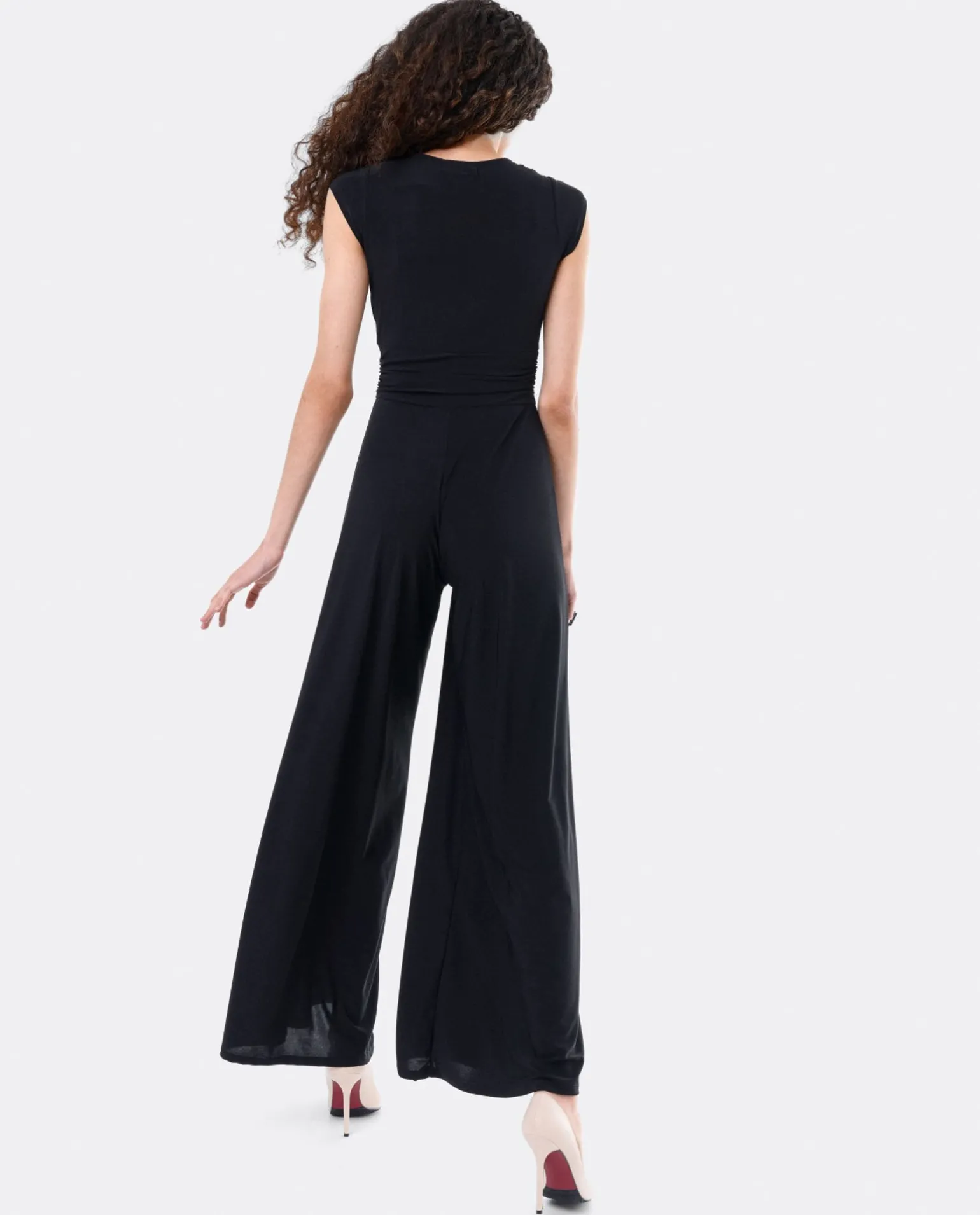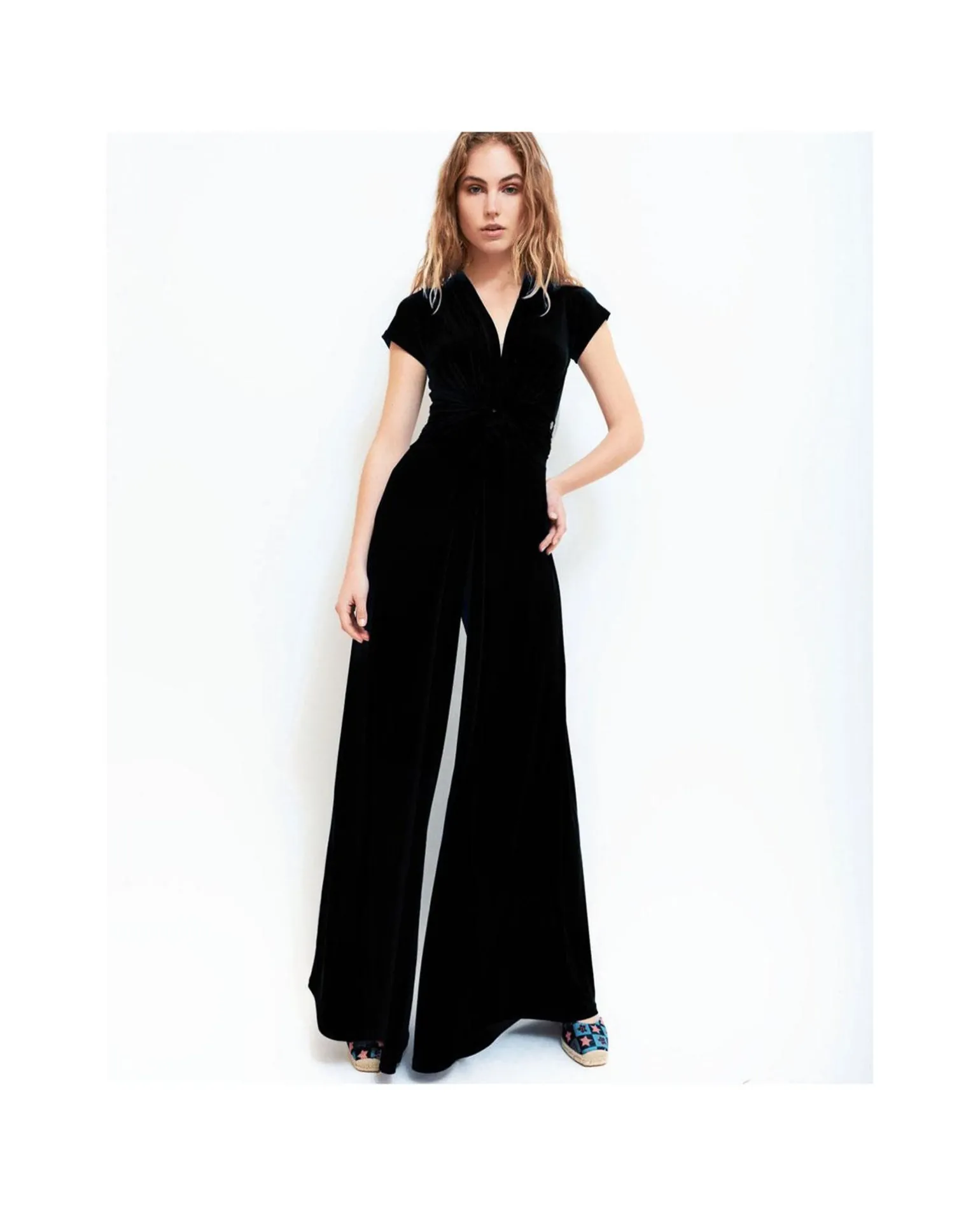 Mono Largo De Punto De Color Negro, Con Cuello V, Mangas Cortas Y Pata De Elefante, Siéntete Confortable Y Elegante Con Este Mono Ideal Para Esta Temporada Primavera-Verano.