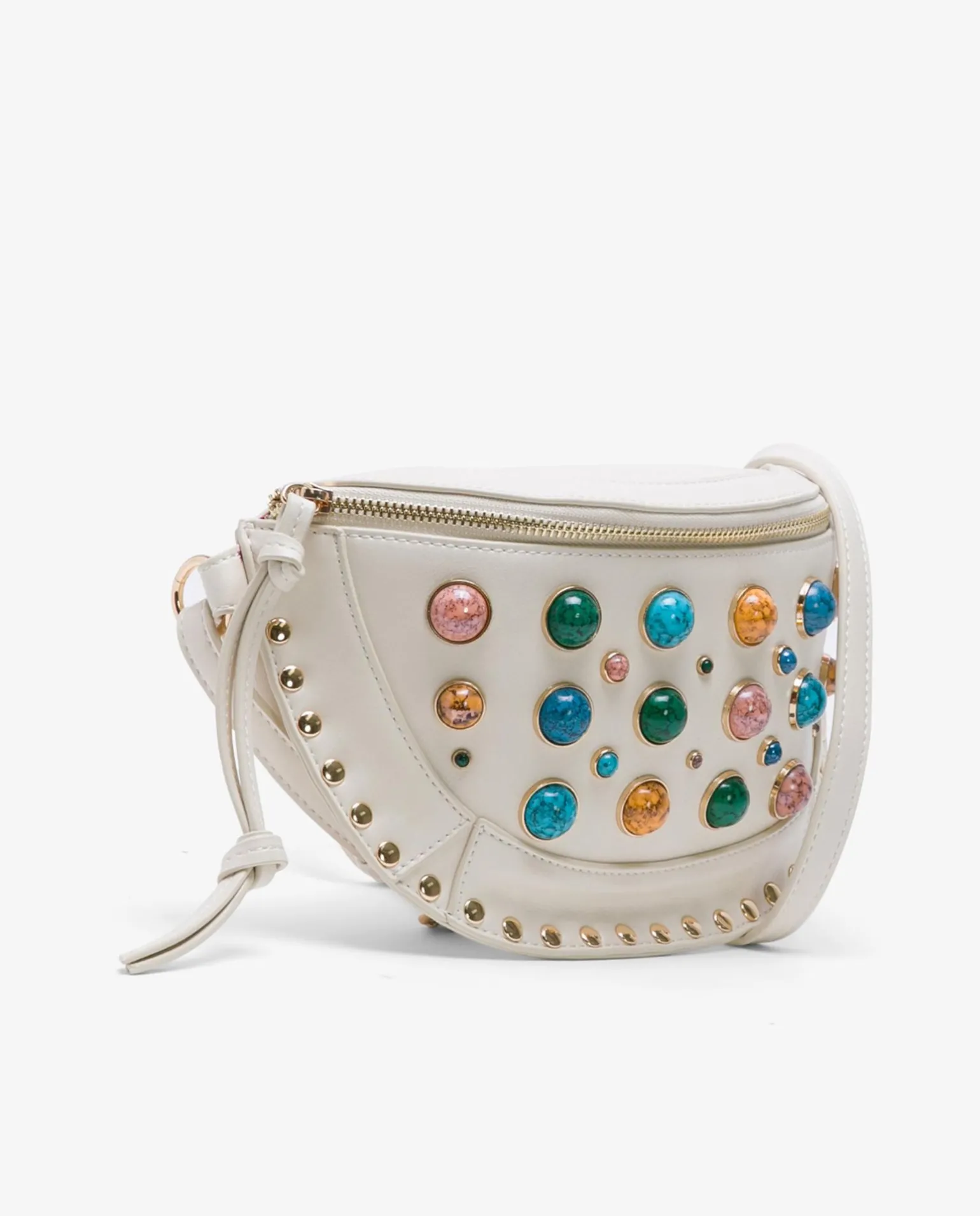 DescripciónBandolera Estilo Riñonera Blanco, Correa Estrecha, Y Decoraciones En Pedrería Y Tachuelas Doradas. Perfecto Para Elevar Los Looks Más Casuales.