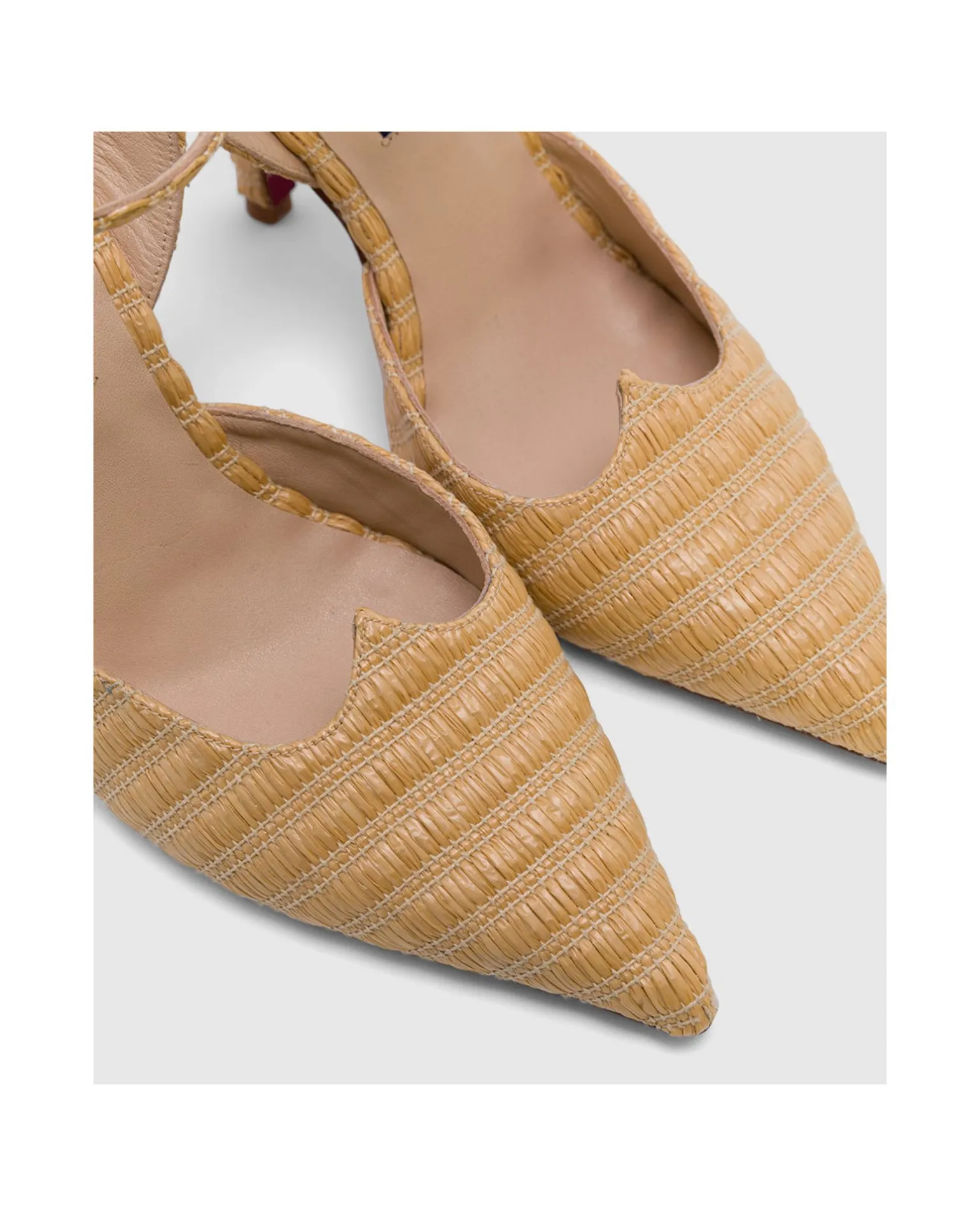 DescripciónSalÓN Destalonado TacÓN,Acabado En Punta,DiseÑAdo En Rafia Color Beig,Cierre Con Pulsera Ajustable Al Tobillo Con Hebilla, Bonito DiseÑO En La Parte Delantera En Forma De CorazÓN.DiseÑAdo Y Fabricado Integramente En EspaÑA.Detalles Del Producto
