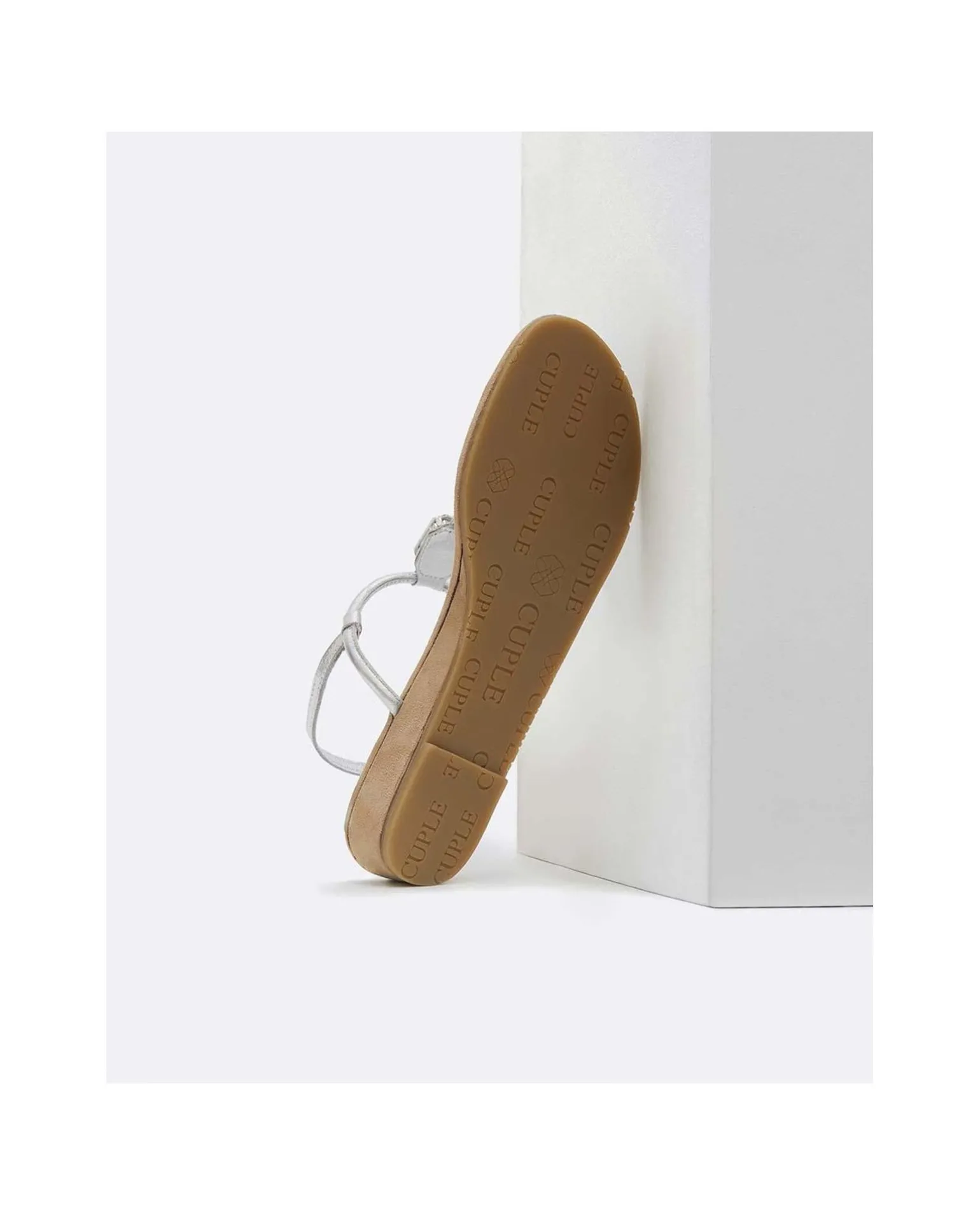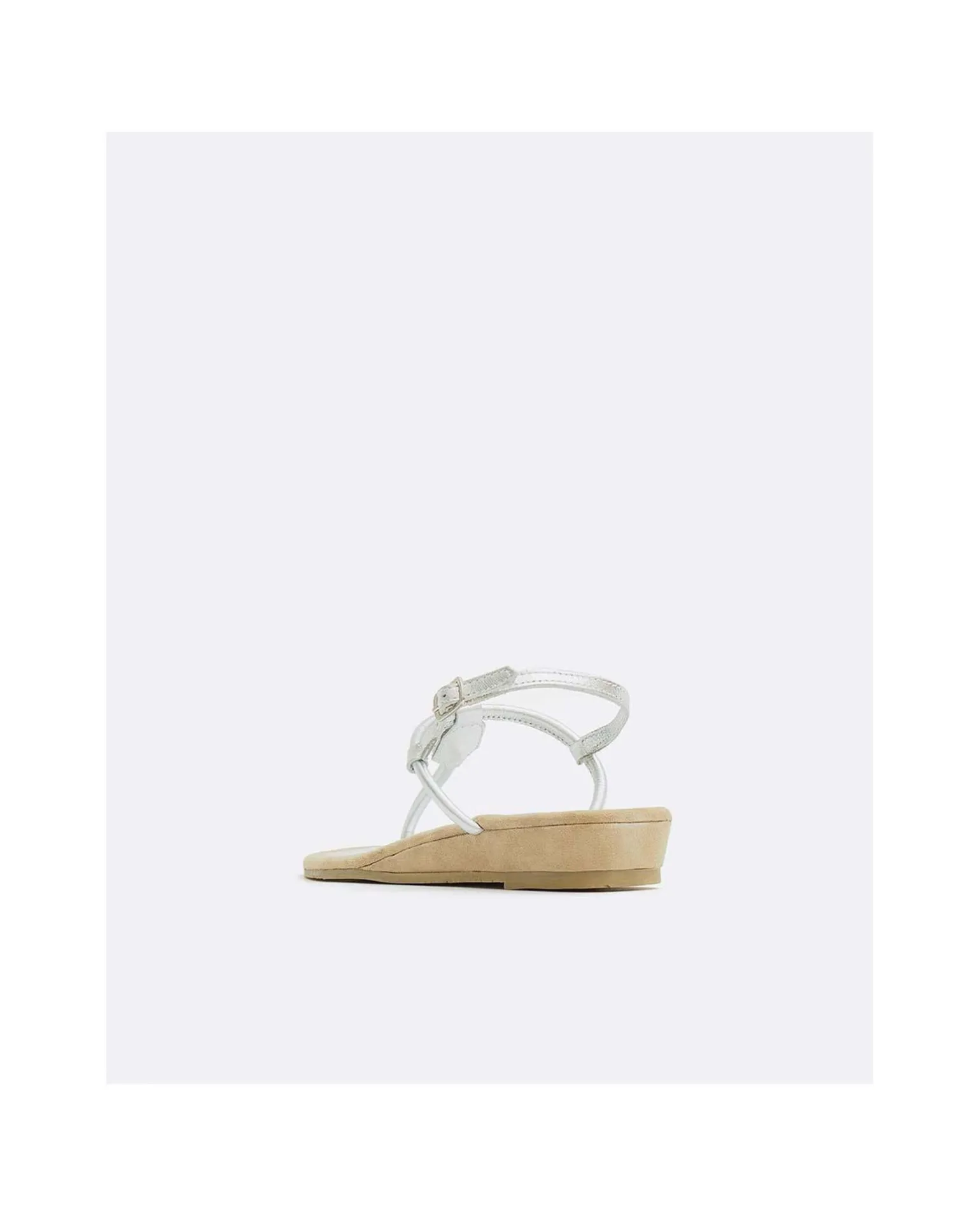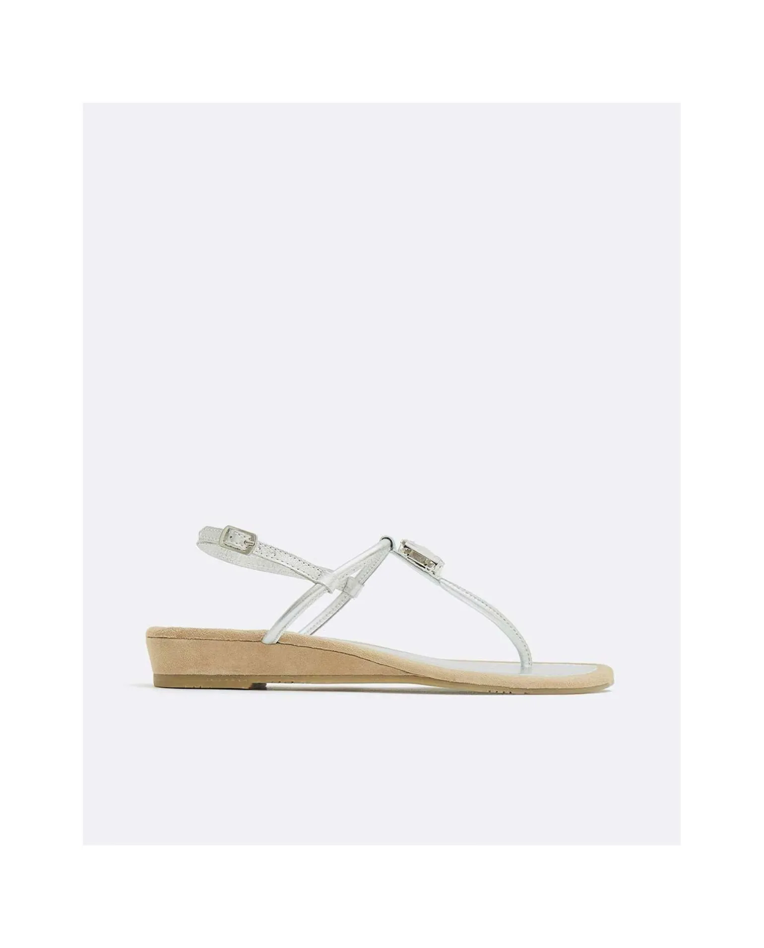 Sandalia Dedo Piel Metalizado Con Detalle Brillante Central Insertado, Con Suela De Cuña Color Marrón Y Hebilla Ajustable Dorada Para Mayor Sujeción.