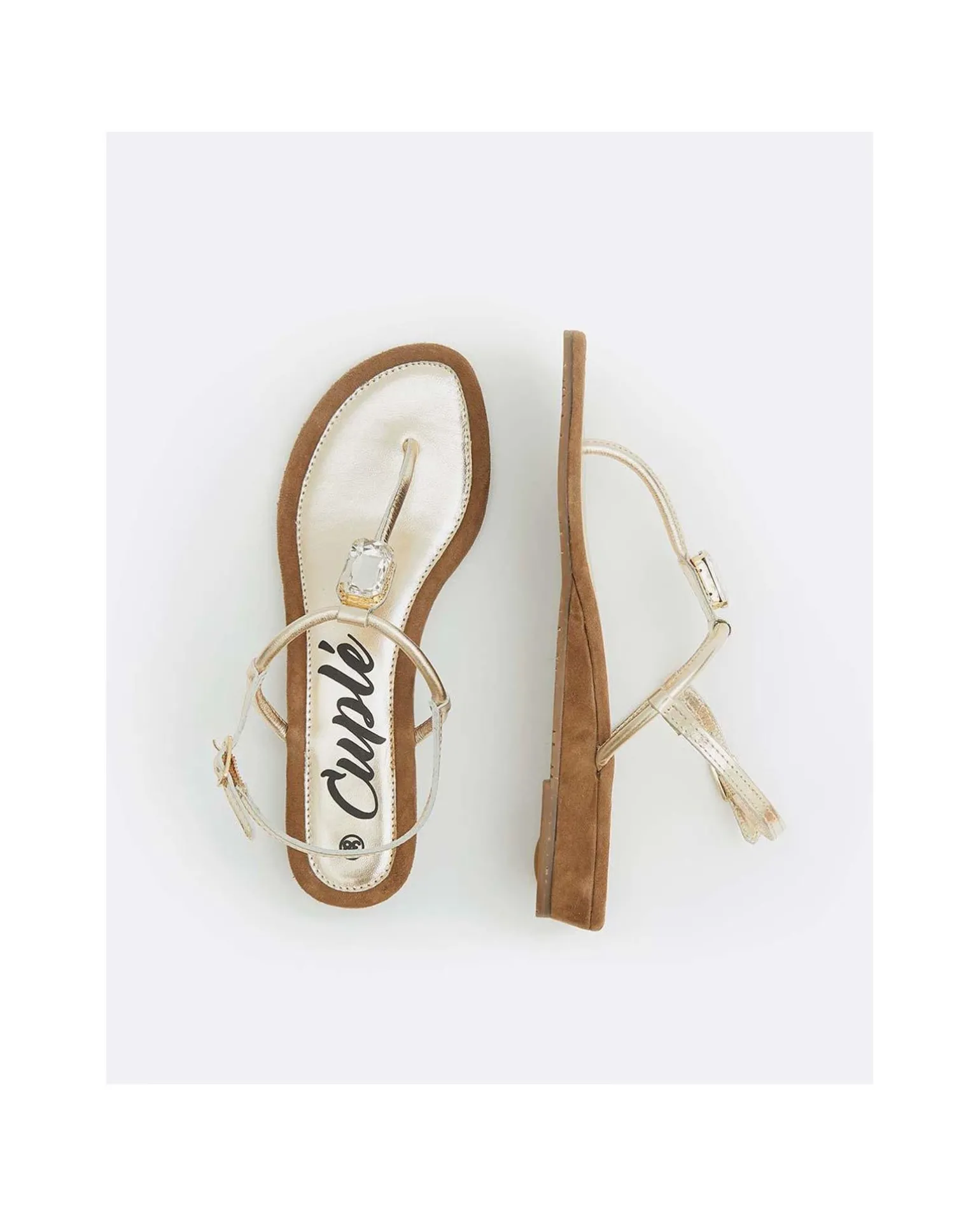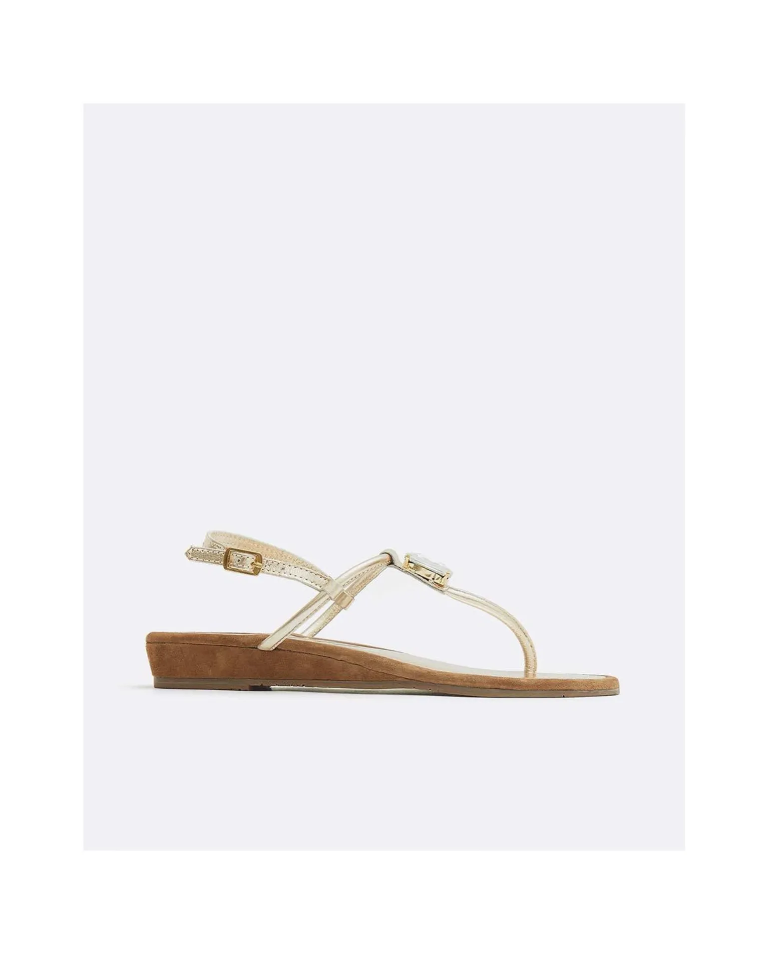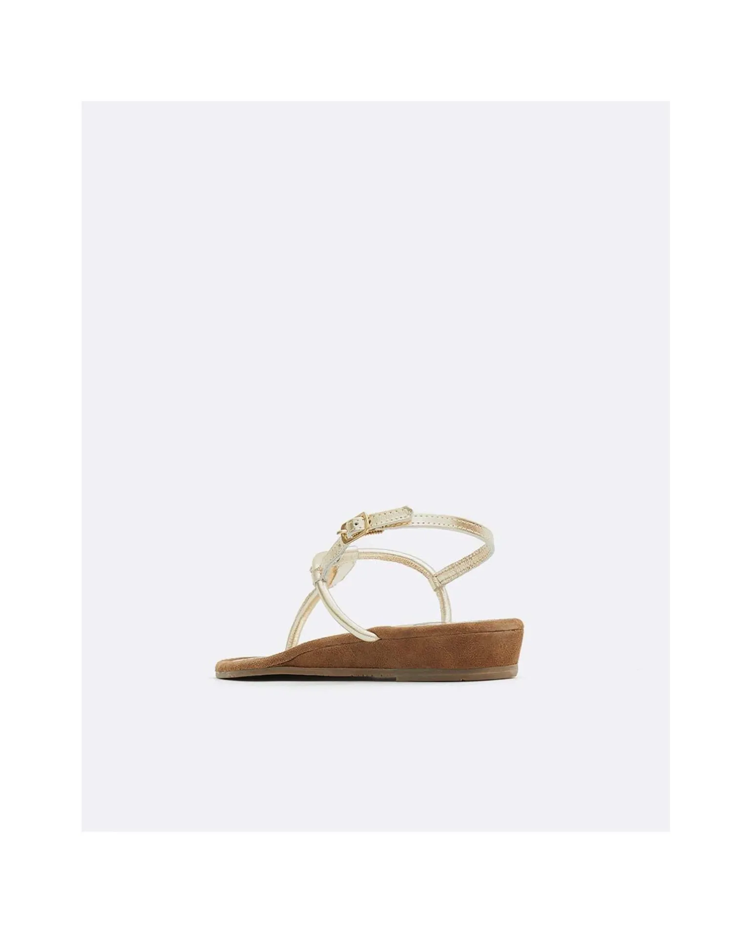 DescripciónSandalia De Piel Color Platino Y Detalle Brillante Central Insertado. Con Suela De CuÑA Color MarrÓN Y Hebilla Ajustable Dorada Para Mayor SujeciÓN.Detalles Del Producto