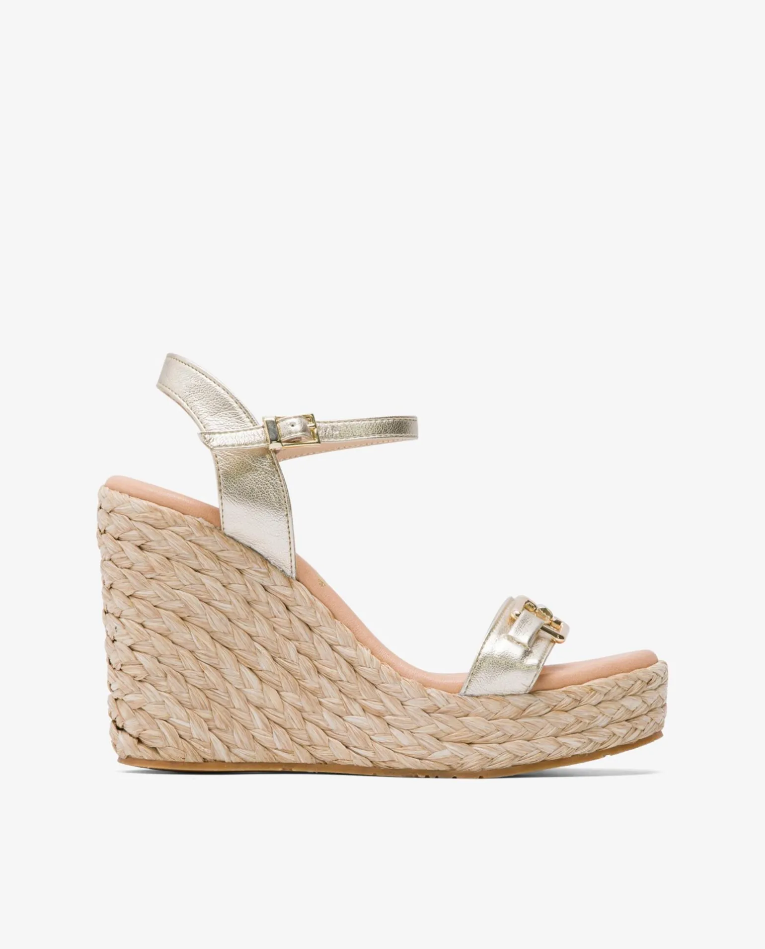 DescripciónSandalia Con Cuña Alta, Tira En La Parte Delantera En Dorado, Y Diseño De Doble Hebilla. Tiene Tira Trasera Y Cierre Con Hebilla Para Una Mejor Sujeción.
