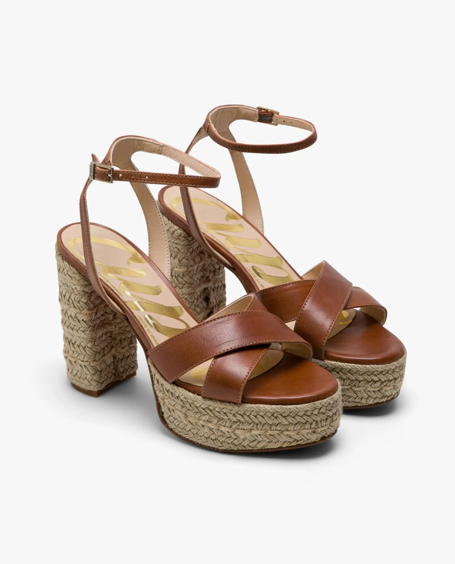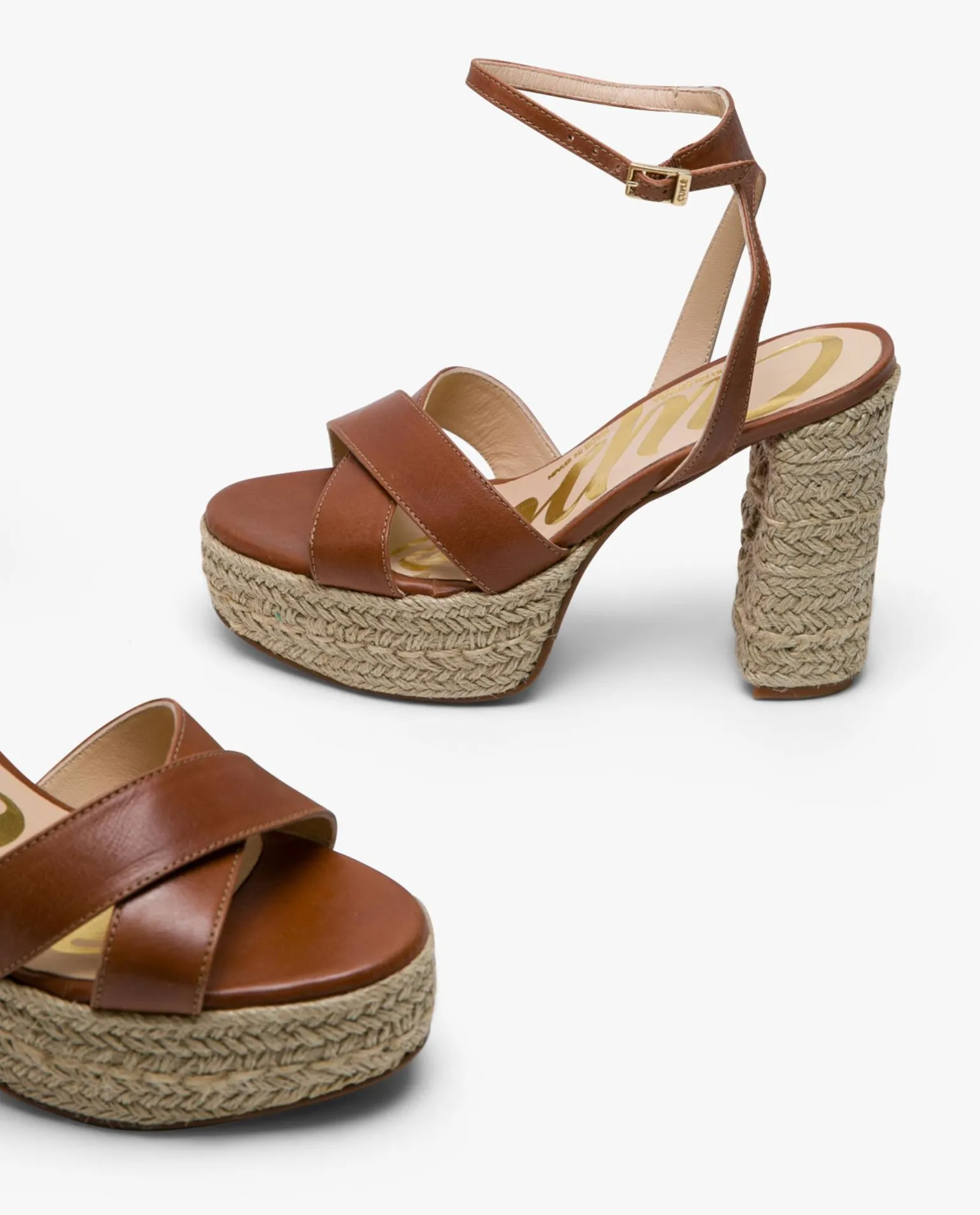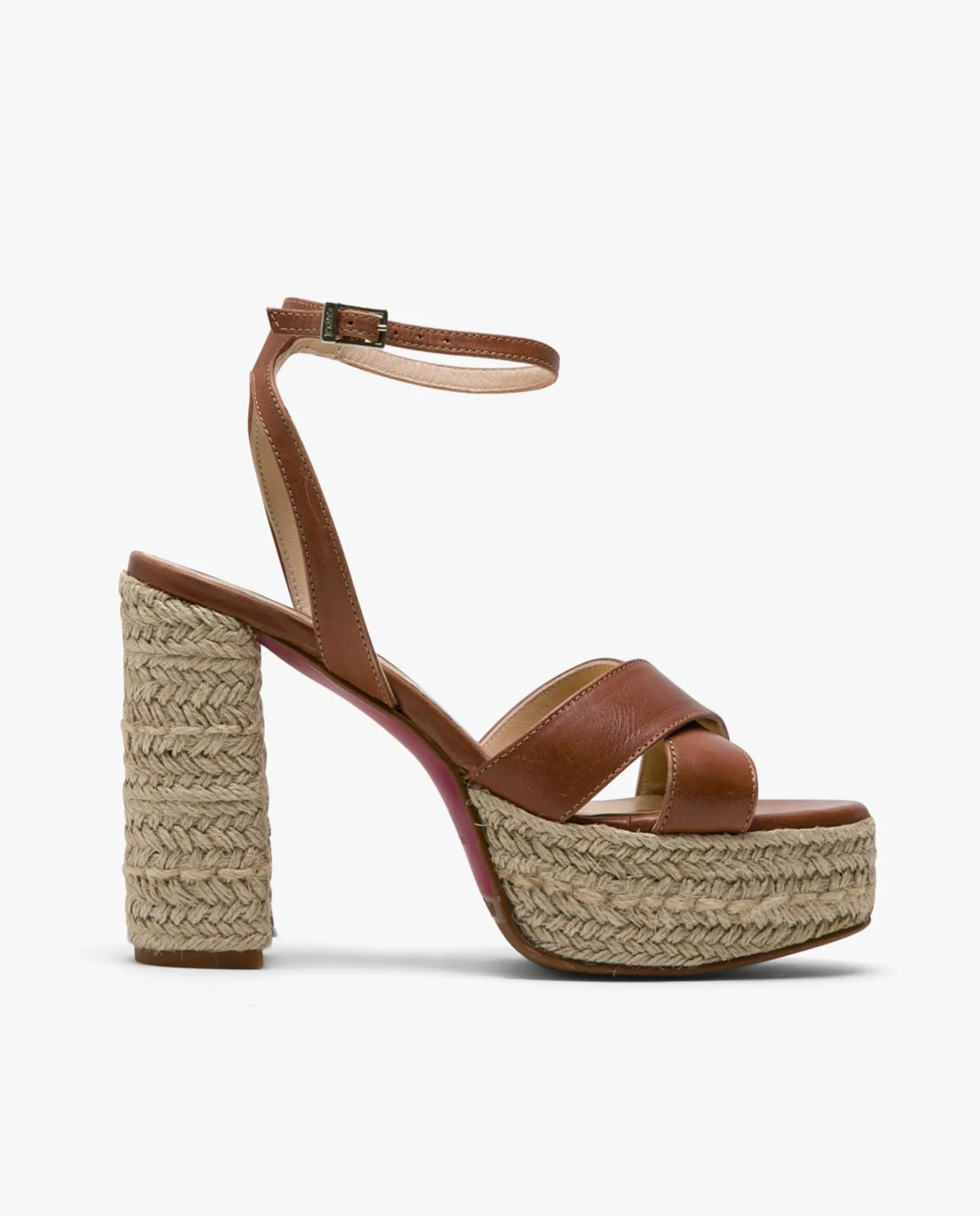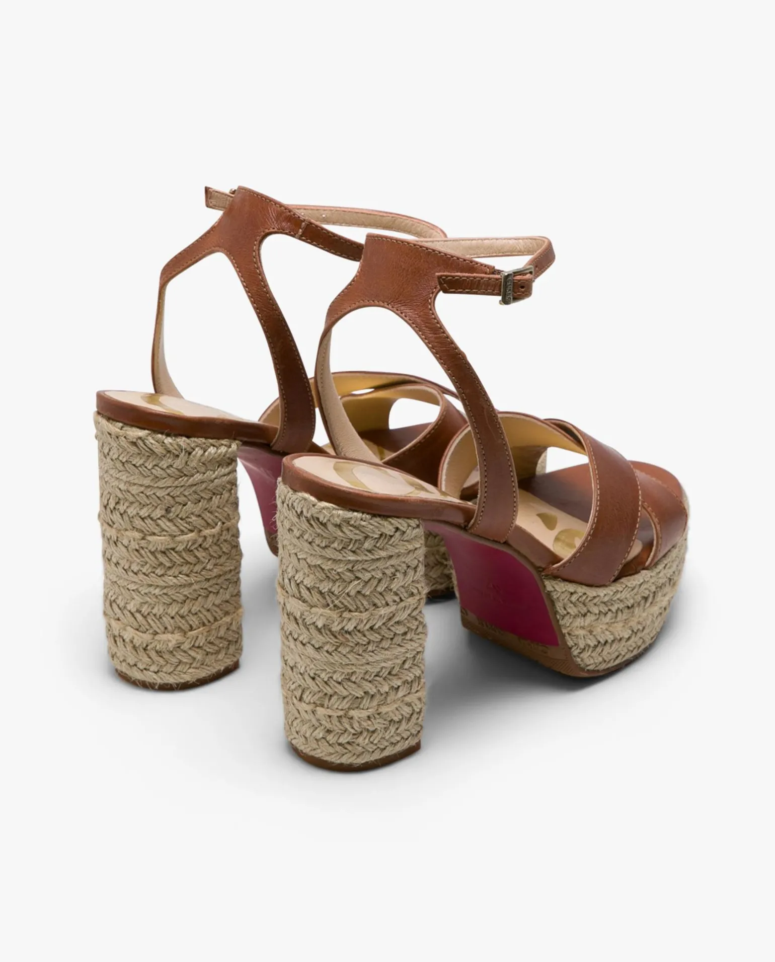 DescripciónSandalia De Tacón Alto Tipo Plataforma, En Yute Y Piel, Con Tiras Delanteras Cruzadas Color Marrón, Talón Al Descubierto Y Tobillera Con Cierre Por Hebilla.