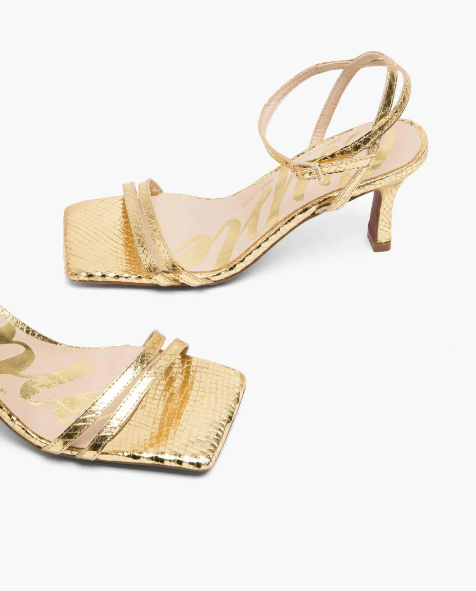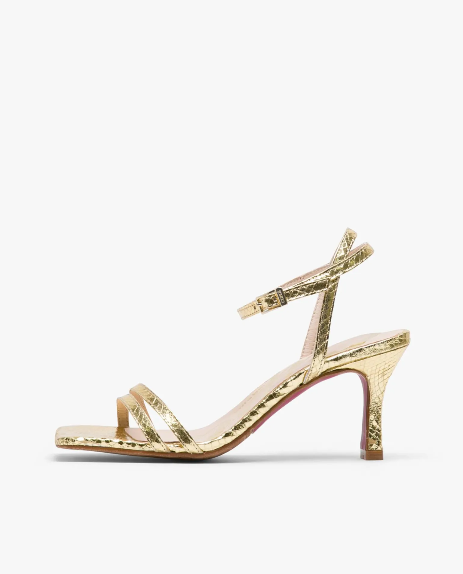 DescripciónSandalia Tipo Pala, De Tacón Medio, Con Textura De Serpiente Y Color Oro. Caracterizadas Por Tiras Delgadas En La Parte Frontal Y Sujeción Al Tobillo Para Mayor Firmeza Con Cierre De Hebilla.