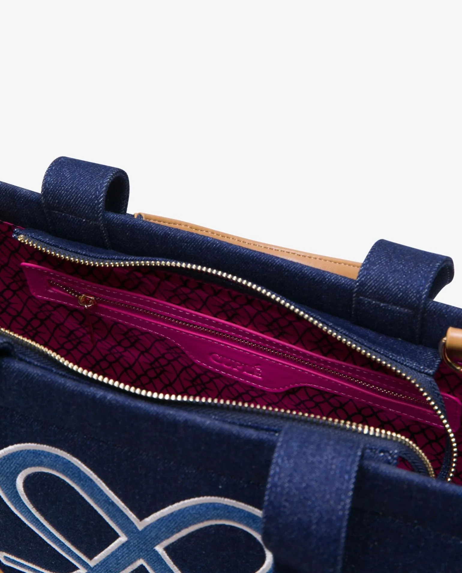DescripciónTotte Bag Denim Azul Oscuro Con Maxilogo En Azul Claro Y Correas Reforzadas En Marrón. Ideal Para Los Looks Del Día A Día.