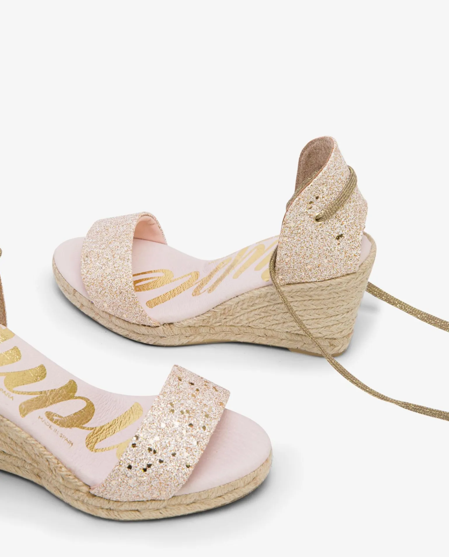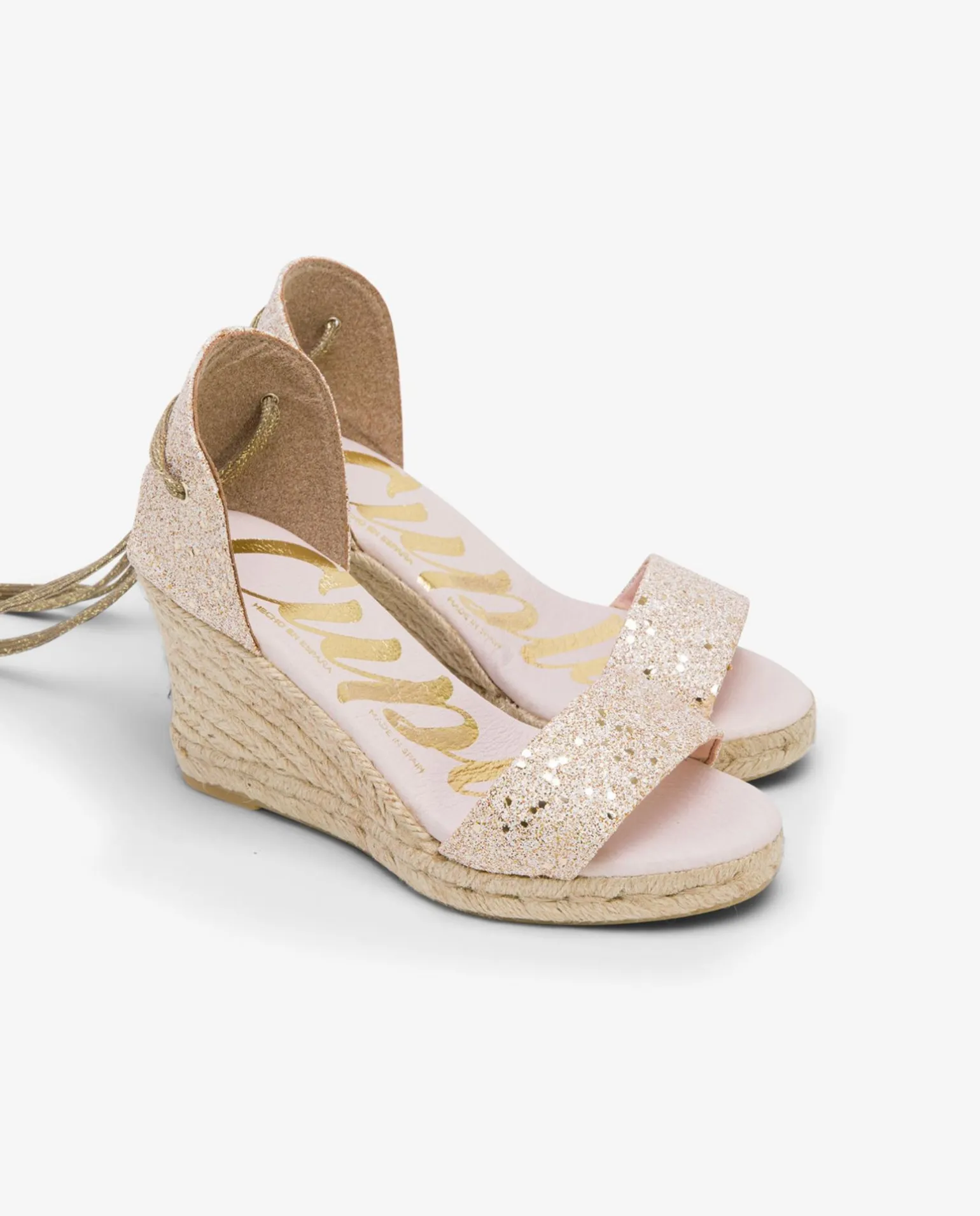 DescripciónCuña Diseñada En Yute, Con Adorno En Tejido Glitter.