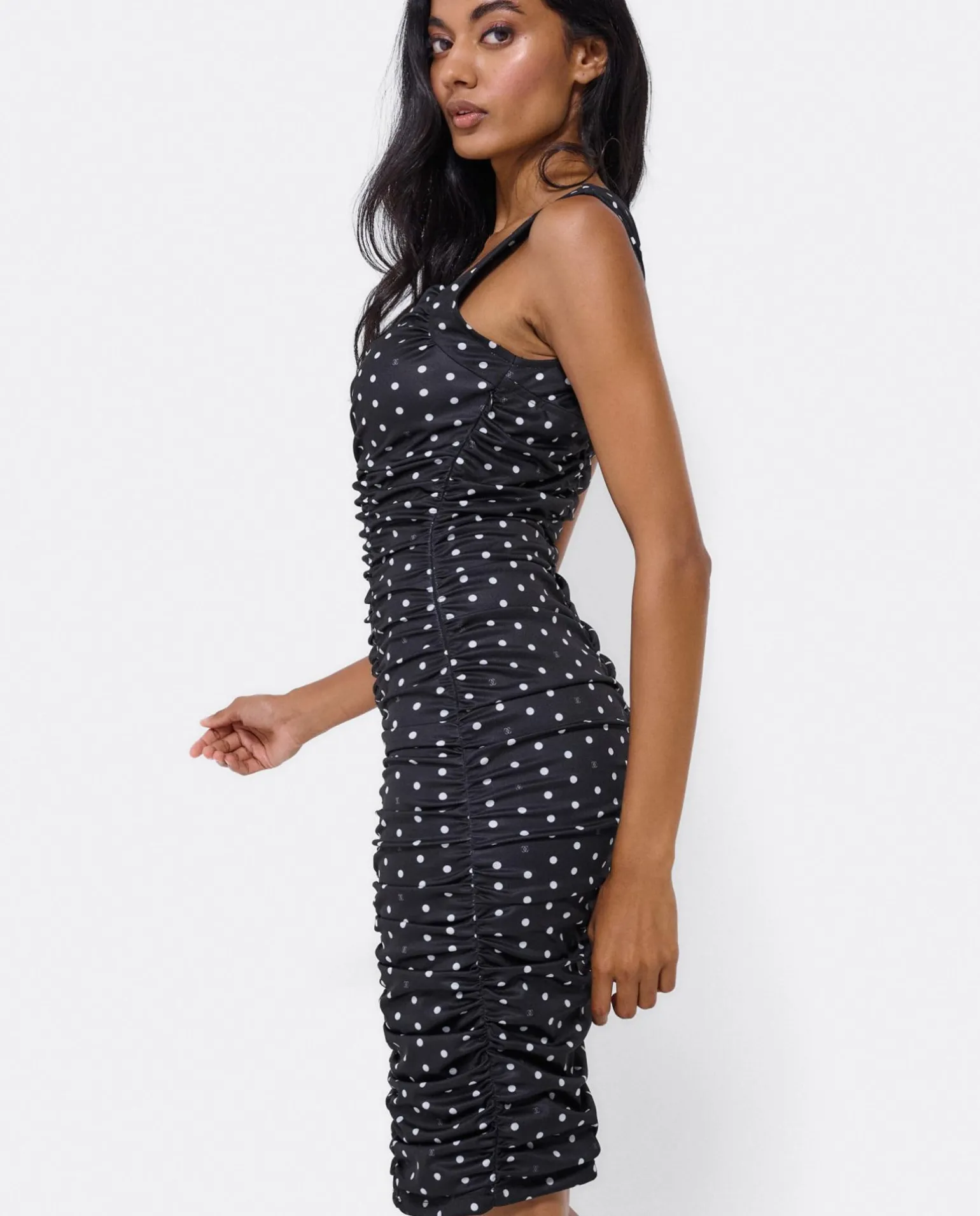 DescripciónMini Vestido Drapeado Escote De Corazón De Tirantes Estampado De Lunares Con Logo Cuplé Con Cremallera Lateral Invisible.