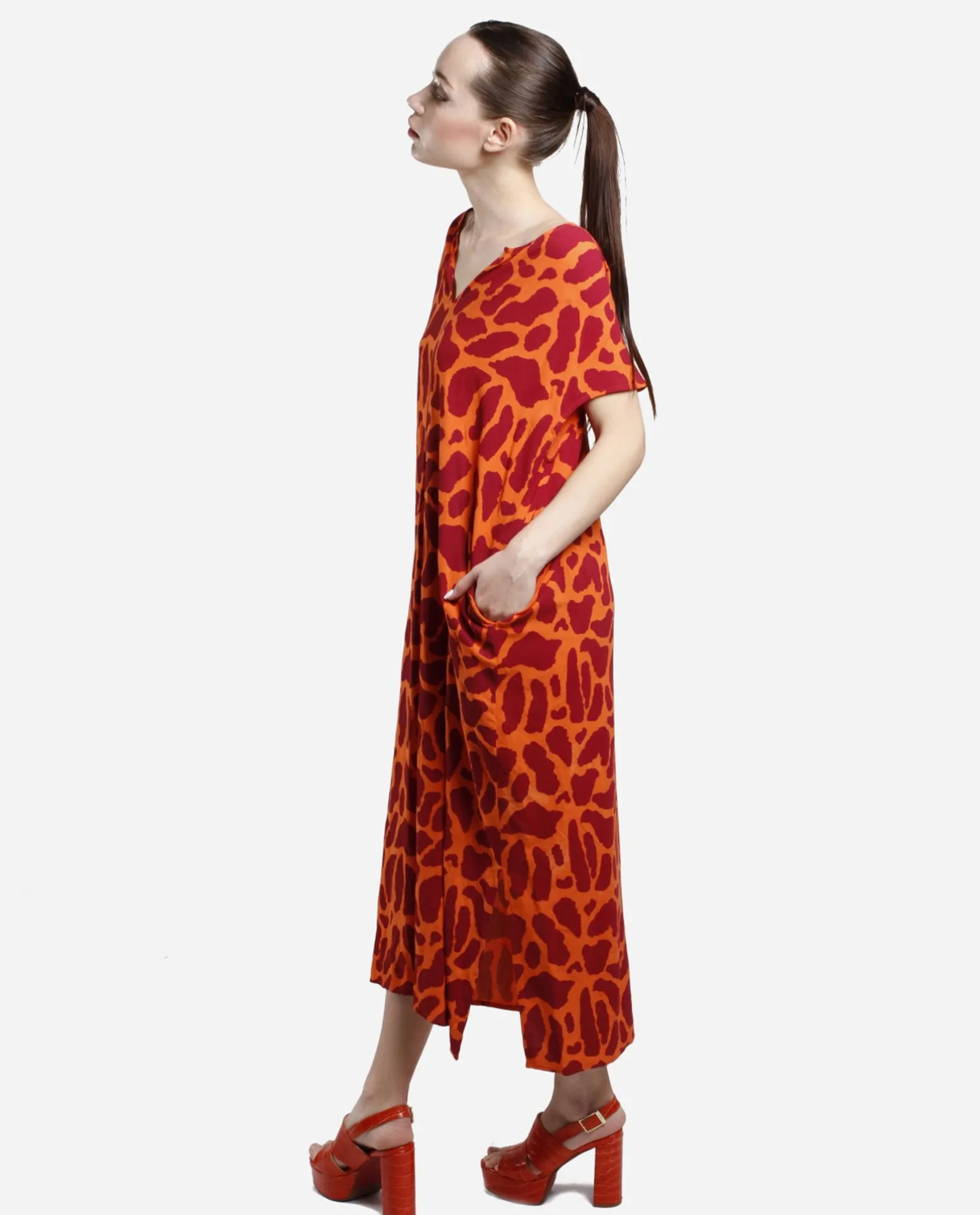 DescripciónVestido Camisero De Corte Recto, Manga Corta, Escote Picó Y Abertura En Los Laterales. Con Estampado De Jirafa En Tonos Naranjas Y Rojizos. Ideal Para Darle Un Toque De Color A Los Looks Más Playeros.
