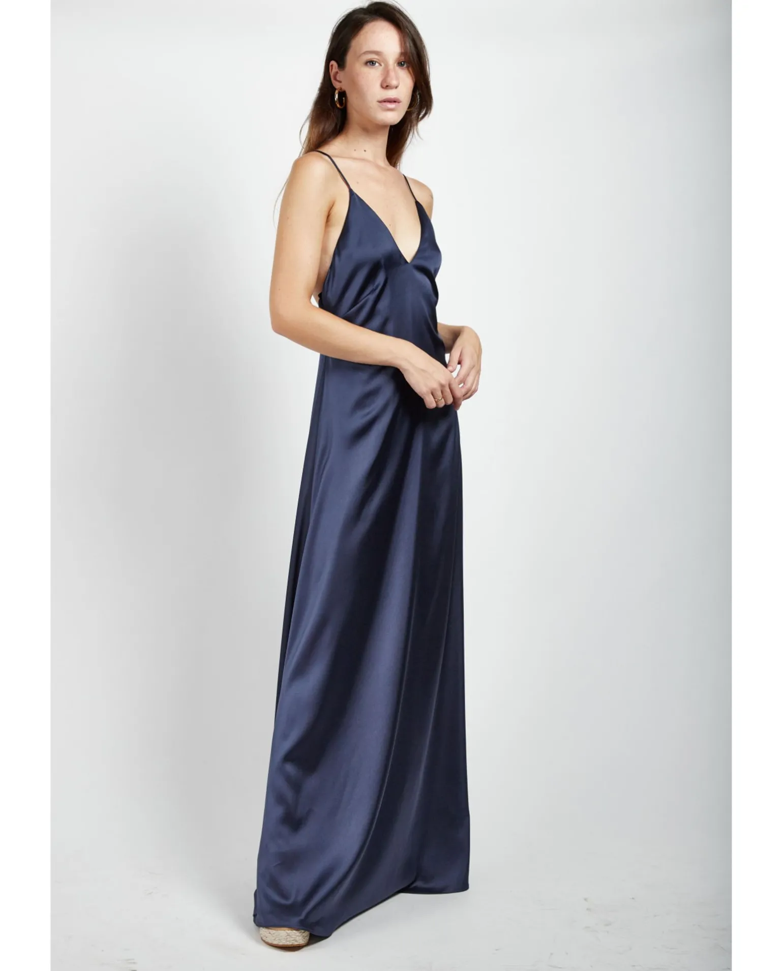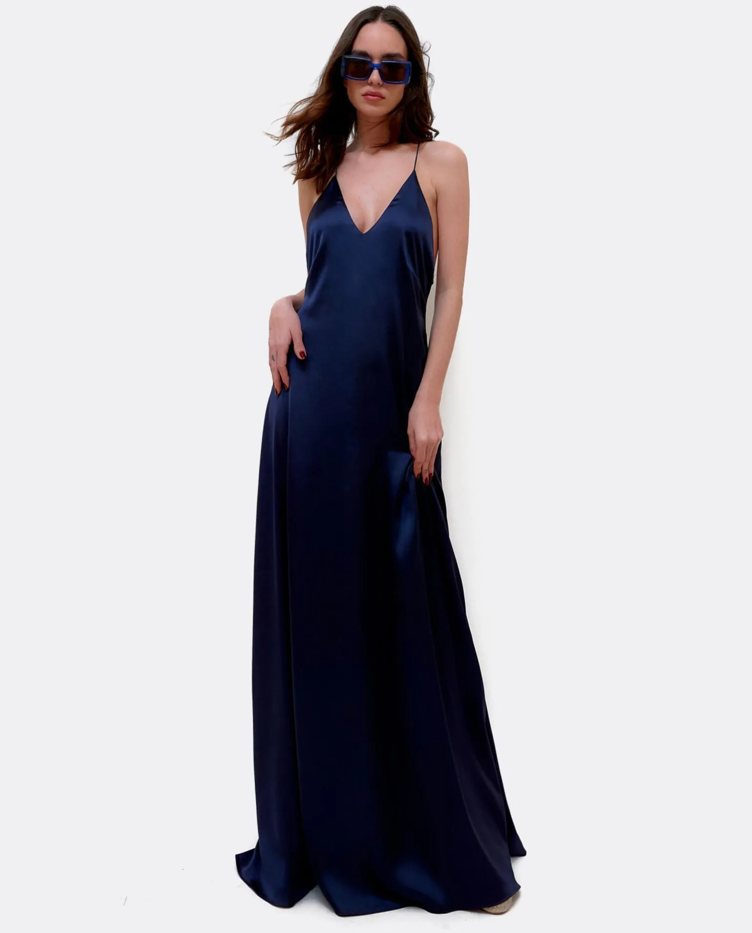 DescripciónVestido Largo De Tirantes De SatÉN Azul Marino. Escotado Y Suelto Con Espalda Abierta. Elegante Para Cualquier Evento Tanto De DÍA Como De Noche.Detalles Del Producto