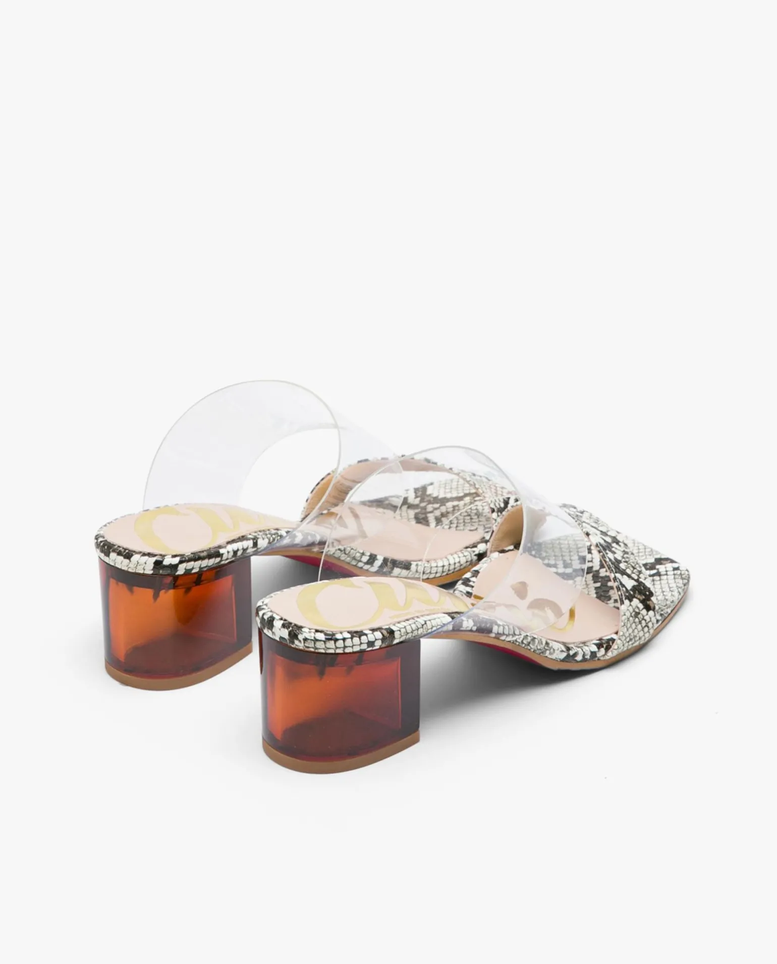 DescripciónZueco Con Tacón Medio, Tira Gruesa En Vinilo Y Tira Delgada En Estampado Serpiente. Con Tonos Grises Y Negros.